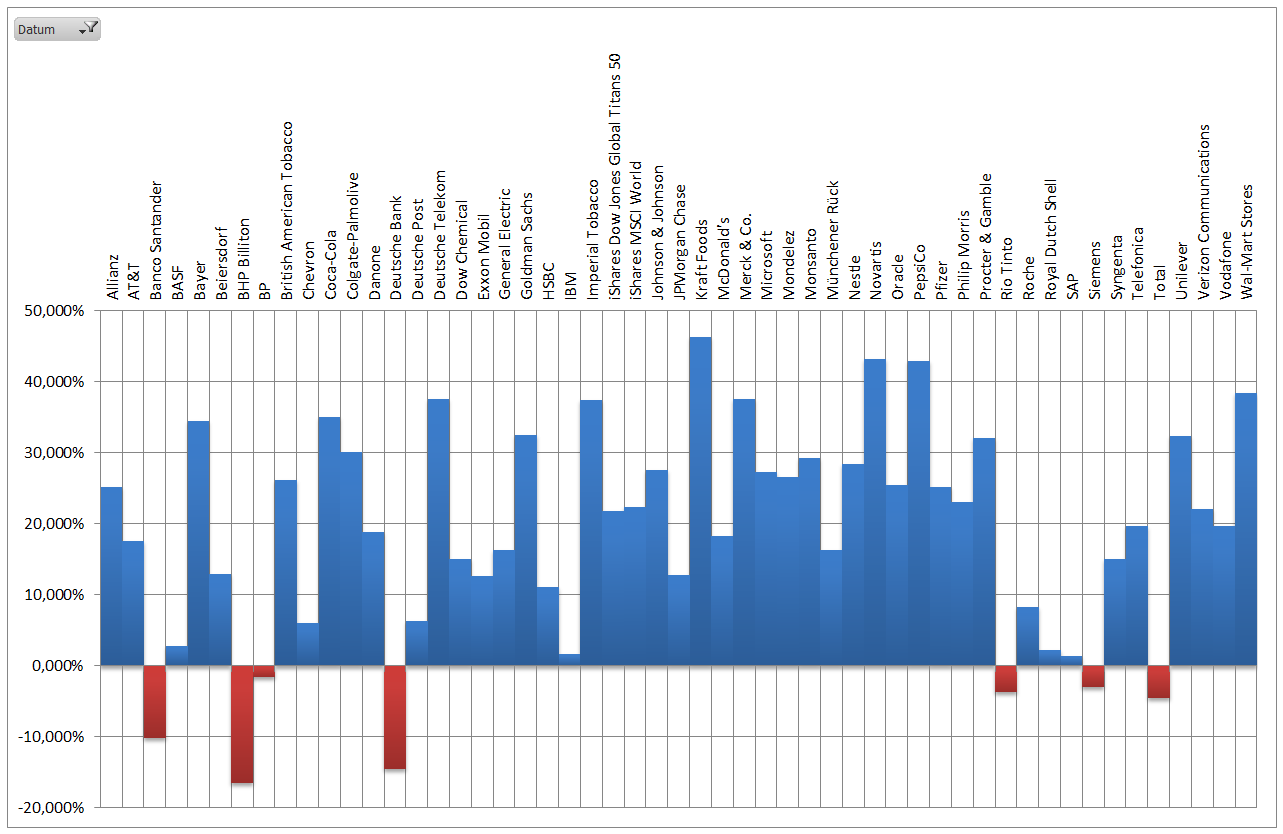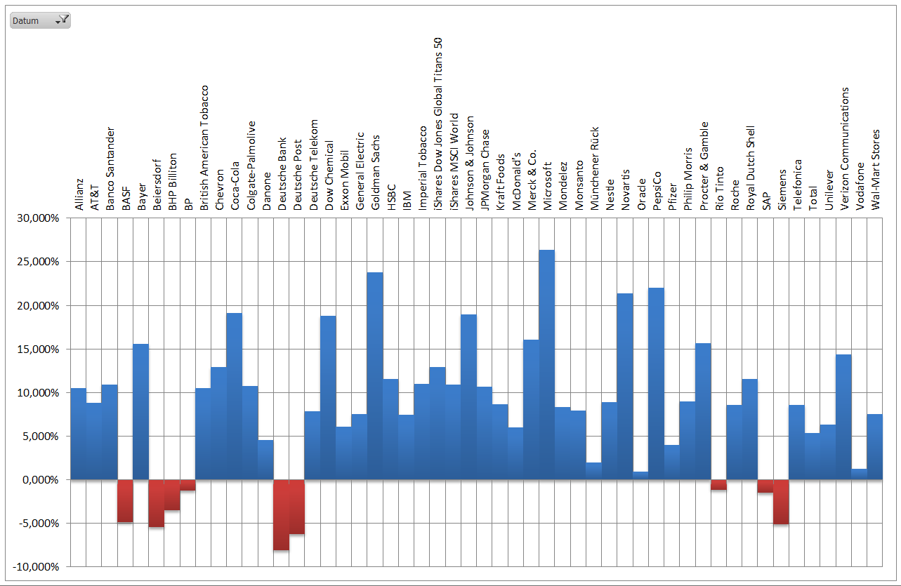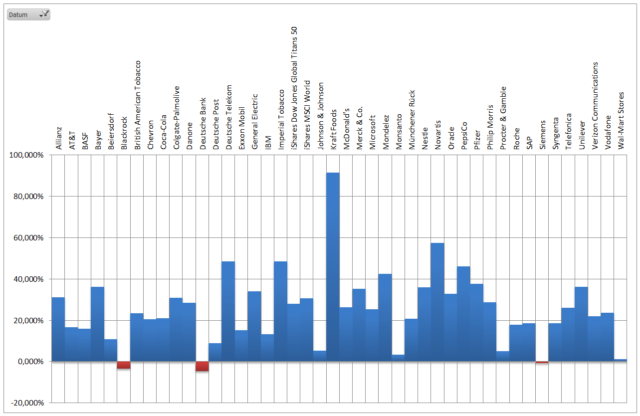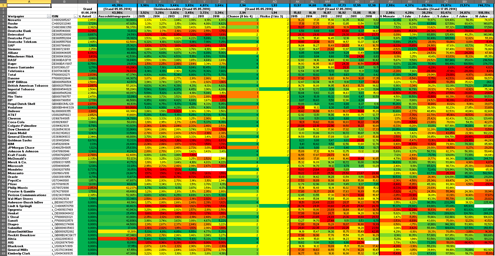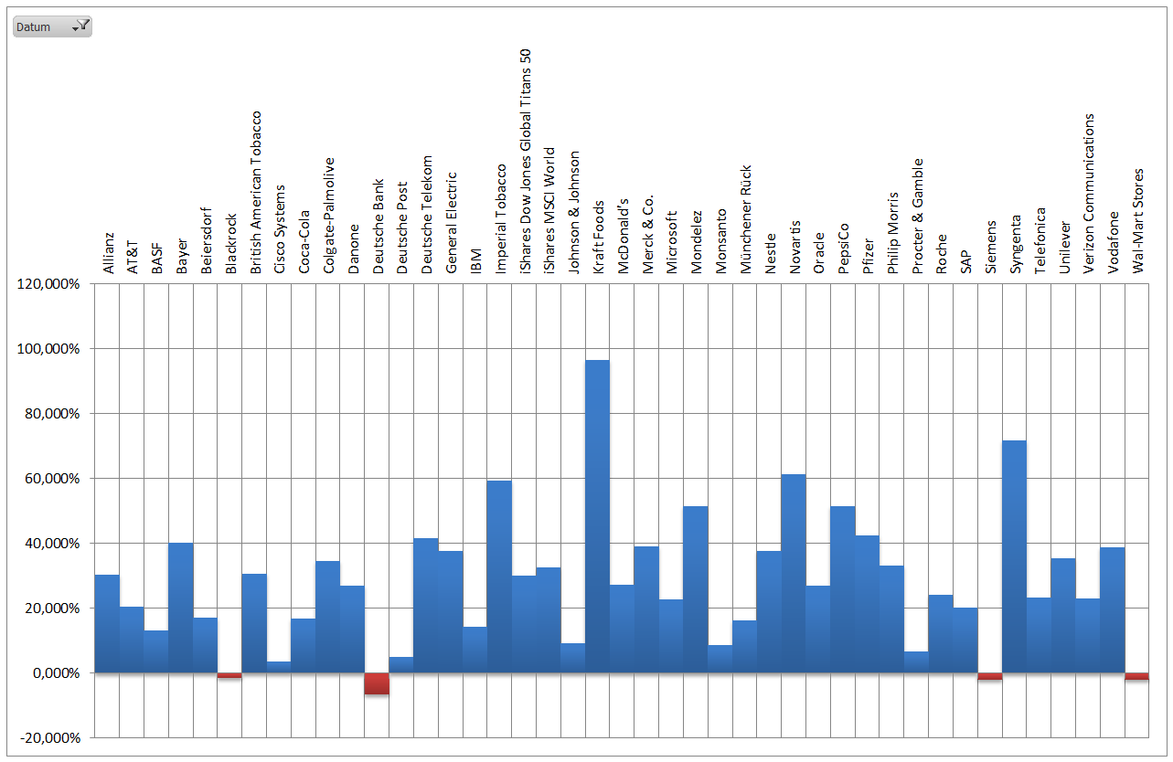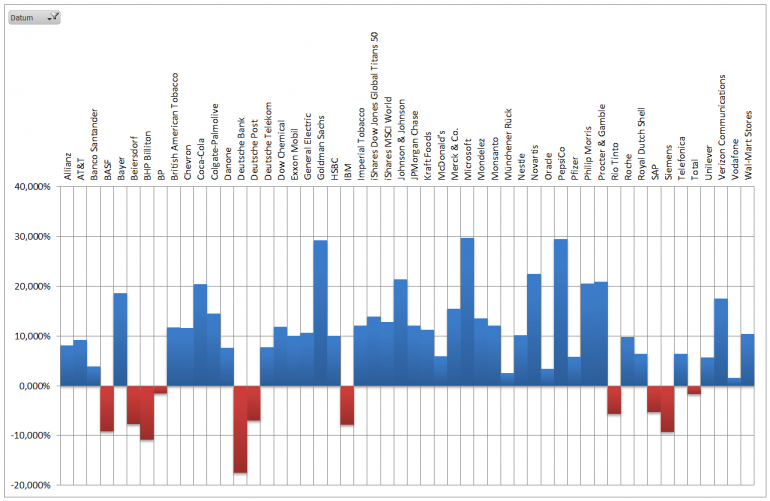 Hamsterrad Mai 1, 2015 Monatlicher Bericht (2015-04) Dividenden seit dem letzten Bericht: Zukäufe seit dem letzten Bericht: Microsoft (teilweise Umschichtung) Wal-Mart Stores (teilweise Umschichtung) Siemens (Umschichtung) AT&T (Umschichtung) Blackrock (Umschichtung) IBM (Umschichtung) Johnson & Johnson (Umschichtung) Procter & Gamble (Umschichtung) Coca-Cola (Umschichtung) Monsanto (Umschichtung) Verkäufe seit dem letzten Bericht: HSBC (Umschichtung) BP (Umschichtung) Dow Chemical (Umschichtung) BHP Billiton (Umschichtung) Rio Tinto (Umschichtung) Total (Umschichtung) Royal Dutch Shell (Umschichtung) Aktuelle Gewichtung und Zukäufe Unternehmen: Aktuelle Gewichtung Branchen / Sektoren / Länder / Währungen: Aktuelle Gewichtung je Branche: Übersicht mit Kennzahlen: Performance seit Auflegung inkl. Vergleichsindexes: Aktuelle GuV Unternehmen + Vergleichsindexes: Diesen Beitrag teilen Link zum Beitrag