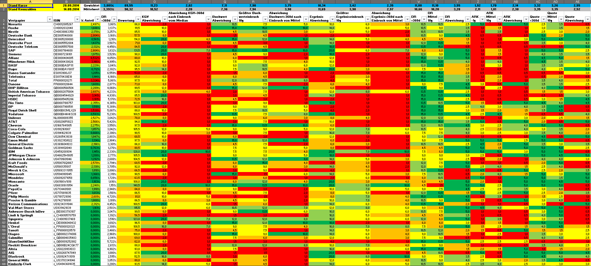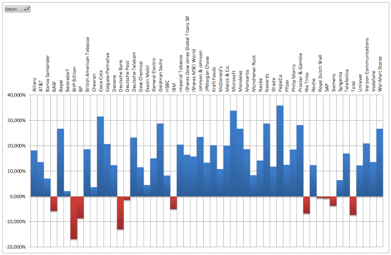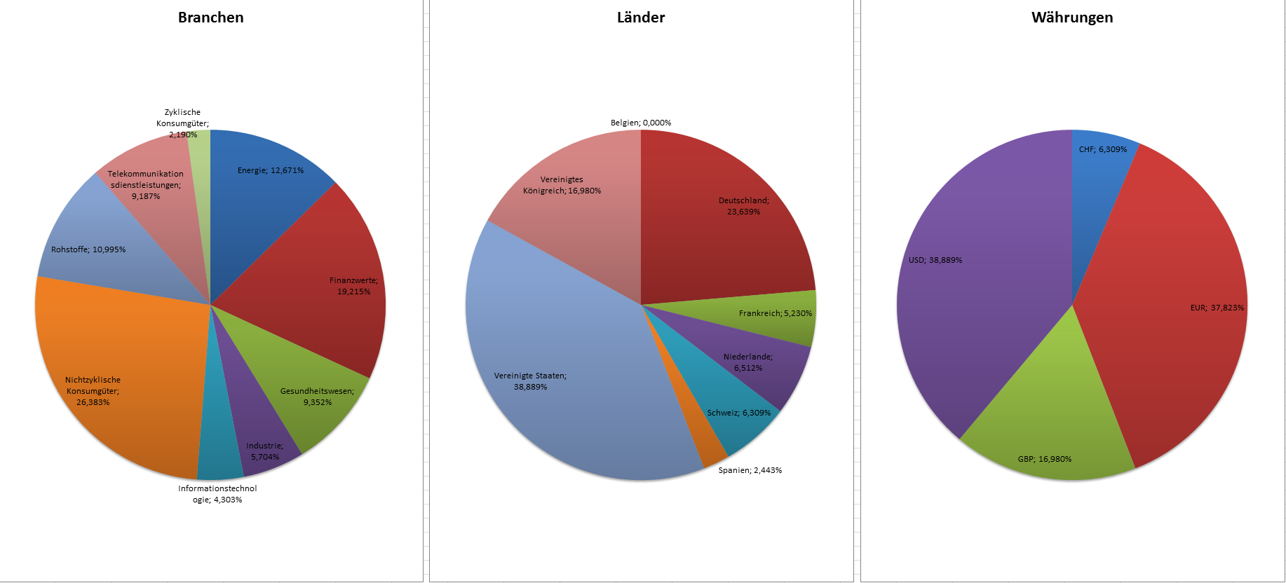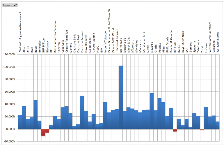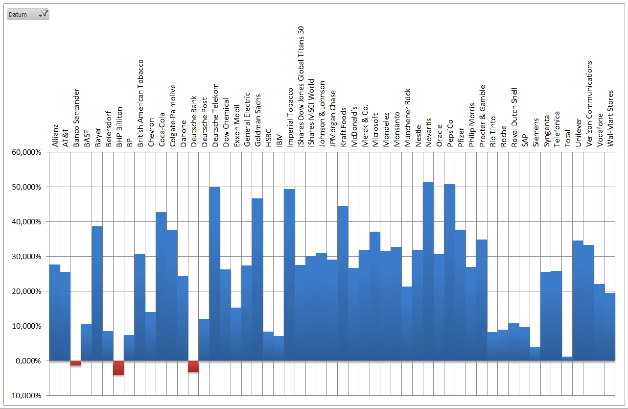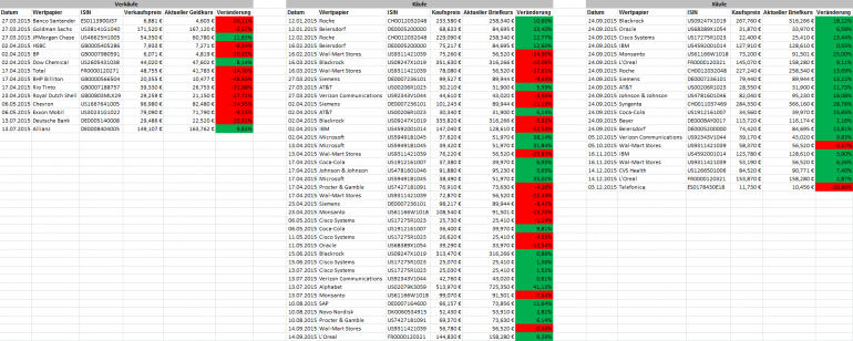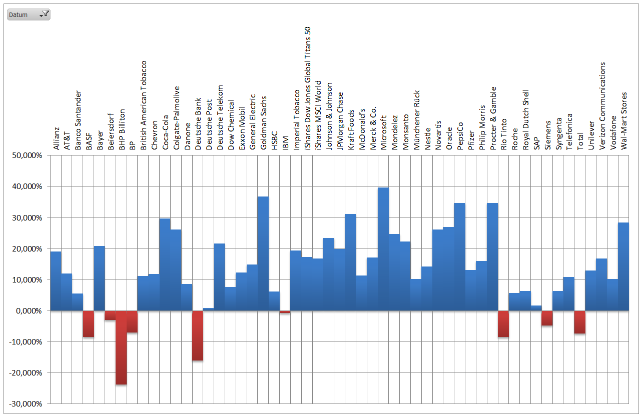 Hamsterrad Mai 1, 2015 Monatlicher Bericht (2015-04) Dividenden seit dem letzten Bericht: Zukäufe seit dem letzten Bericht: Microsoft (teilweise Umschichtung) Wal-Mart Stores (teilweise Umschichtung) Siemens (Umschichtung) AT&T (Umschichtung) Blackrock (Umschichtung) IBM (Umschichtung) Johnson & Johnson (Umschichtung) Procter & Gamble (Umschichtung) Coca-Cola (Umschichtung) Monsanto (Umschichtung) Verkäufe seit dem letzten Bericht: HSBC (Umschichtung) BP (Umschichtung) Dow Chemical (Umschichtung) BHP Billiton (Umschichtung) Rio Tinto (Umschichtung) Total (Umschichtung) Royal Dutch Shell (Umschichtung) Aktuelle Gewichtung und Zukäufe Unternehmen: Aktuelle Gewichtung Branchen / Sektoren / Länder / Währungen: Aktuelle Gewichtung je Branche: Übersicht mit Kennzahlen: Performance seit Auflegung inkl. Vergleichsindexes: Aktuelle GuV Unternehmen + Vergleichsindexes: Diesen Beitrag teilen Link zum Beitrag