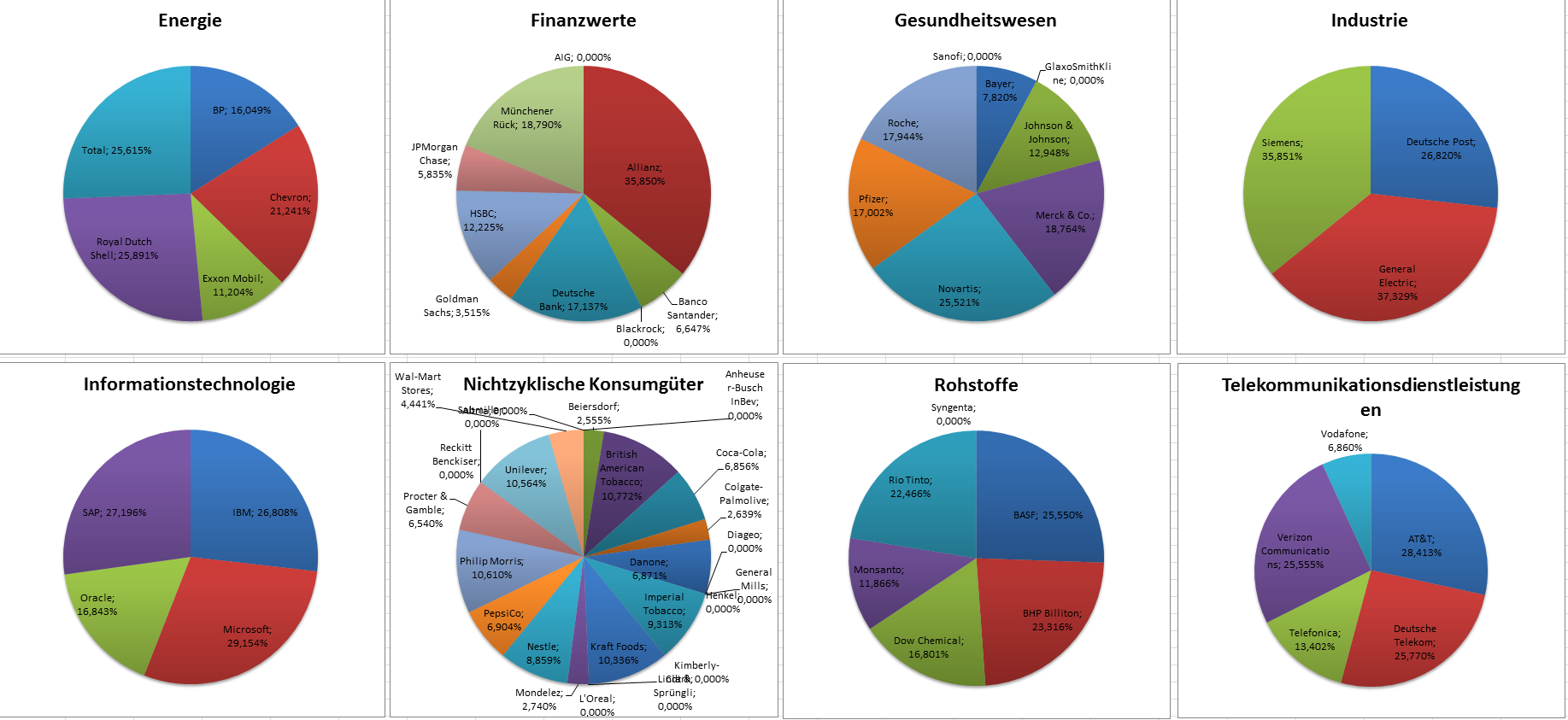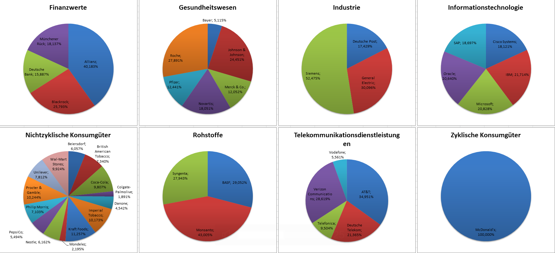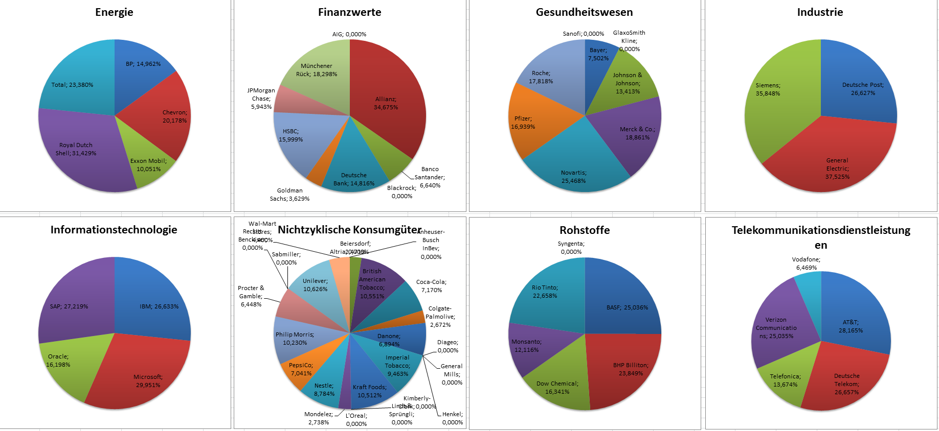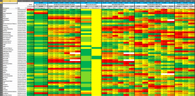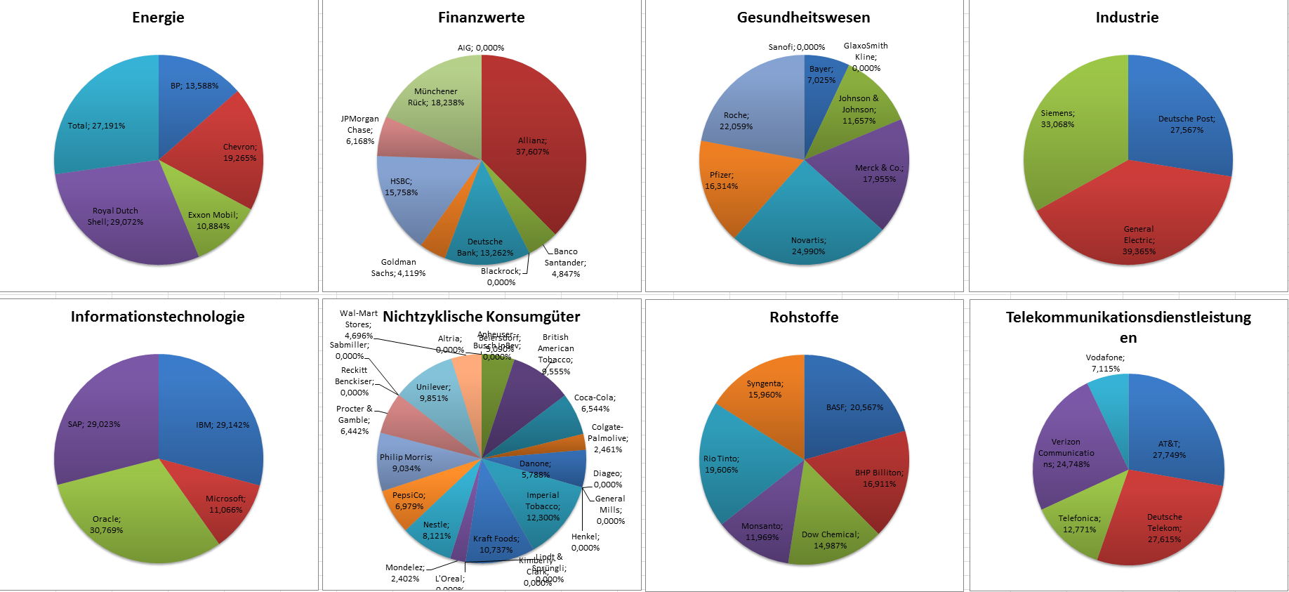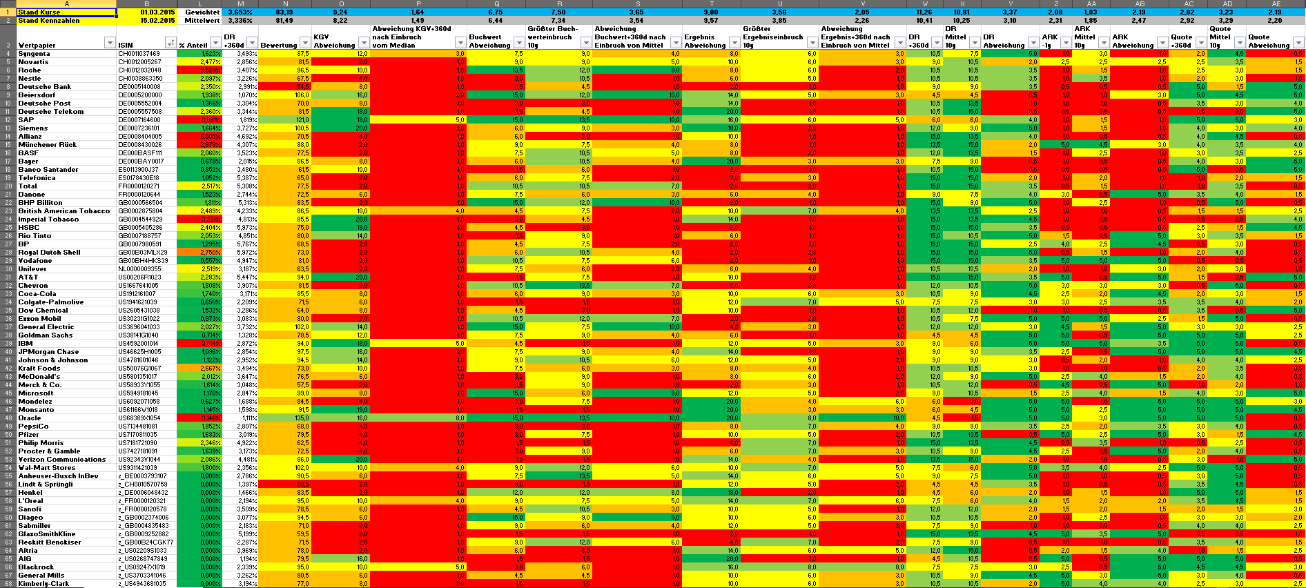 Hamsterrad Mai 1, 2015 Monatlicher Bericht (2015-04) Dividenden seit dem letzten Bericht: Zukäufe seit dem letzten Bericht: Microsoft (teilweise Umschichtung) Wal-Mart Stores (teilweise Umschichtung) Siemens (Umschichtung) AT&T (Umschichtung) Blackrock (Umschichtung) IBM (Umschichtung) Johnson & Johnson (Umschichtung) Procter & Gamble (Umschichtung) Coca-Cola (Umschichtung) Monsanto (Umschichtung) Verkäufe seit dem letzten Bericht: HSBC (Umschichtung) BP (Umschichtung) Dow Chemical (Umschichtung) BHP Billiton (Umschichtung) Rio Tinto (Umschichtung) Total (Umschichtung) Royal Dutch Shell (Umschichtung) Aktuelle Gewichtung und Zukäufe Unternehmen: Aktuelle Gewichtung Branchen / Sektoren / Länder / Währungen: Aktuelle Gewichtung je Branche: Übersicht mit Kennzahlen: Performance seit Auflegung inkl. Vergleichsindexes: Aktuelle GuV Unternehmen + Vergleichsindexes: Diesen Beitrag teilen Link zum Beitrag