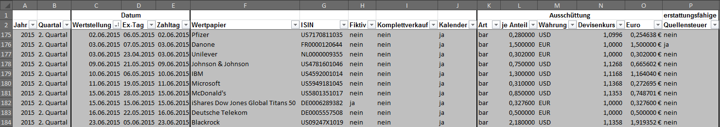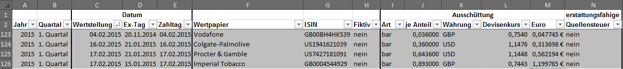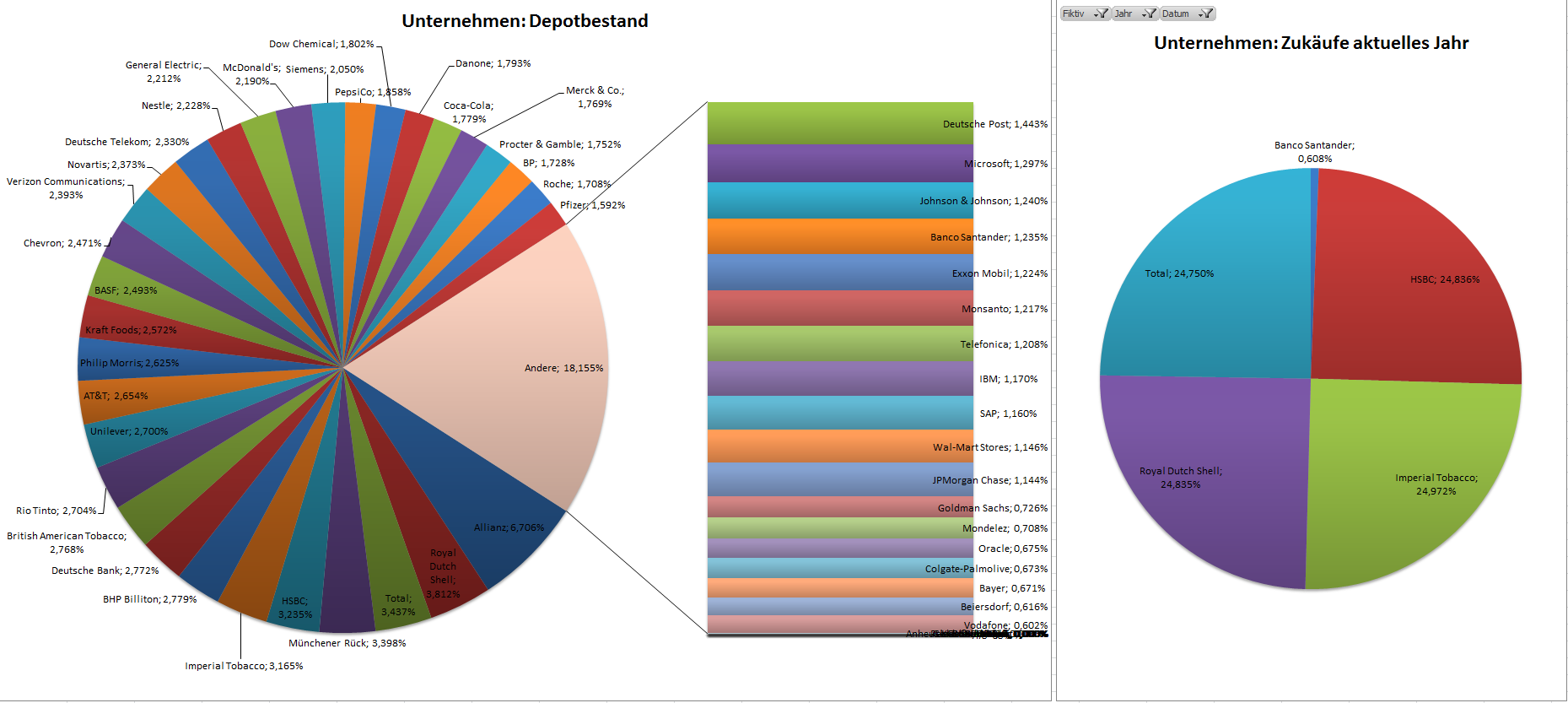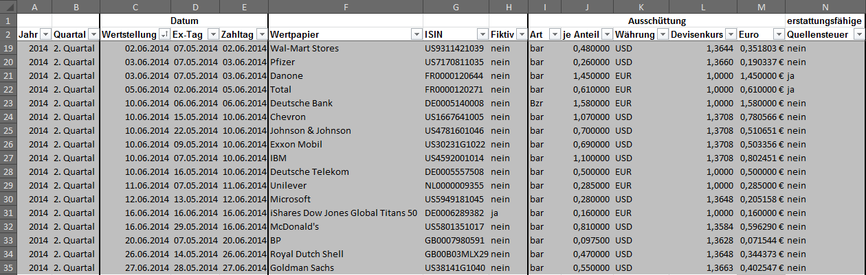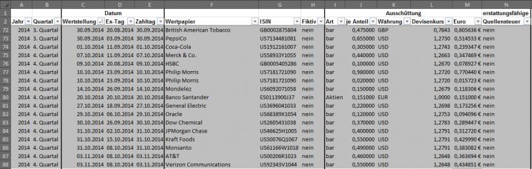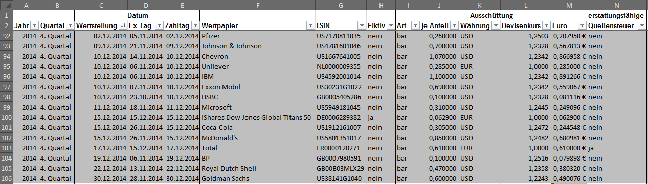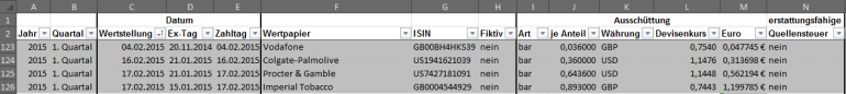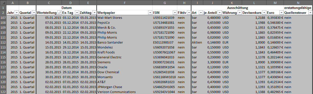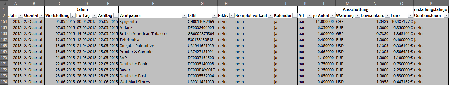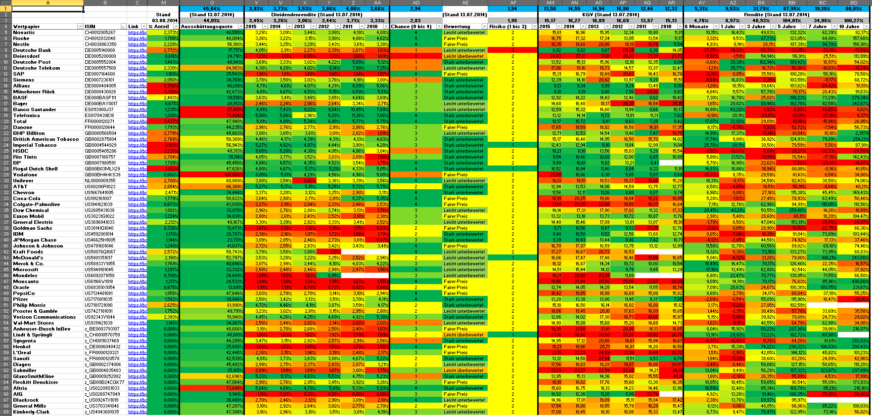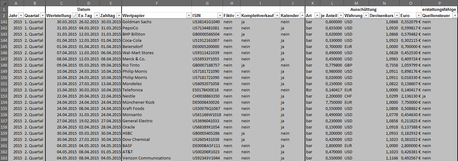 Hamsterrad Mai 1, 2015 Monatlicher Bericht (2015-04) Dividenden seit dem letzten Bericht: Zukäufe seit dem letzten Bericht: Microsoft (teilweise Umschichtung) Wal-Mart Stores (teilweise Umschichtung) Siemens (Umschichtung) AT&T (Umschichtung) Blackrock (Umschichtung) IBM (Umschichtung) Johnson & Johnson (Umschichtung) Procter & Gamble (Umschichtung) Coca-Cola (Umschichtung) Monsanto (Umschichtung) Verkäufe seit dem letzten Bericht: HSBC (Umschichtung) BP (Umschichtung) Dow Chemical (Umschichtung) BHP Billiton (Umschichtung) Rio Tinto (Umschichtung) Total (Umschichtung) Royal Dutch Shell (Umschichtung) Aktuelle Gewichtung und Zukäufe Unternehmen: Aktuelle Gewichtung Branchen / Sektoren / Länder / Währungen: Aktuelle Gewichtung je Branche: Übersicht mit Kennzahlen: Performance seit Auflegung inkl. Vergleichsindexes: Aktuelle GuV Unternehmen + Vergleichsindexes: Diesen Beitrag teilen Link zum Beitrag