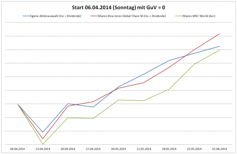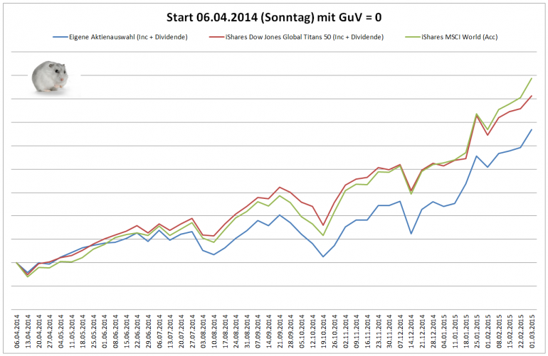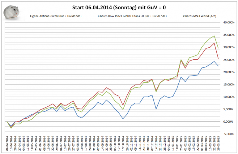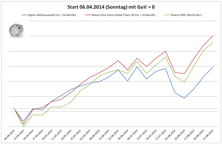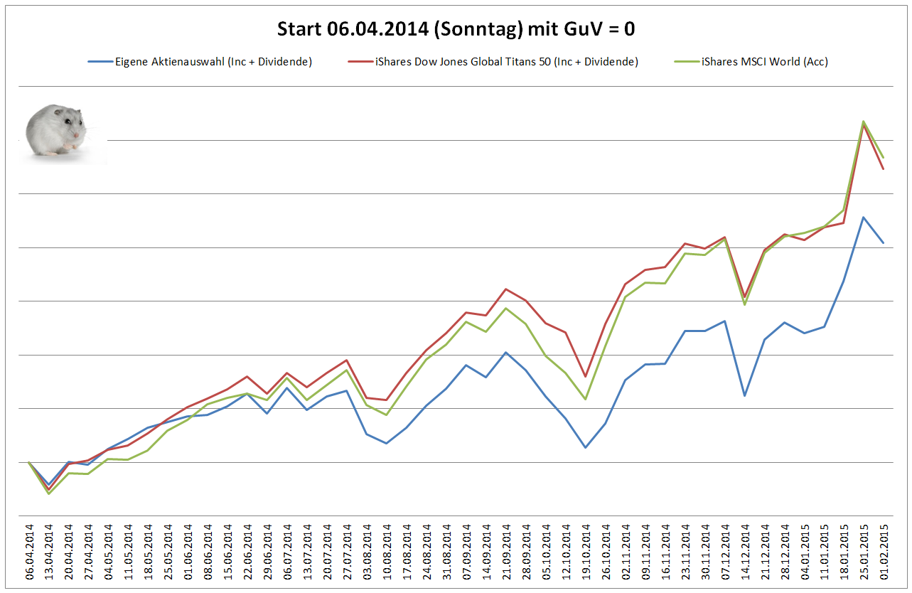 Hamsterrad April 8, 2014 · bearbeitet Februar 23, 2015 von Hamsterrad Spoiler zwecks Übersichtlichkeit eingefügt Aktueller Stand, kurz nach Aufbau des Depots Aktuelle Gewichtung Unternehmen: Aktuelle Gewichtung Branchen: Aktuelle Gewichtung Länder: Aktuelle Gewichtung Währungen: Übersicht mit Kennzahlen: Performance seit Auflegung inkl. Vergleichsindexes: Ein Vergleich nach einem Tag macht noch keinen Sinn - das Bild folgt beim ersten Monatsbericht. Für die Zukunft sind monatliche Berichte im gleichen Stil inkl. der getätigten Zukäufe geplant. Diesen Beitrag teilen Link zum Beitrag