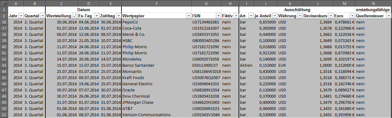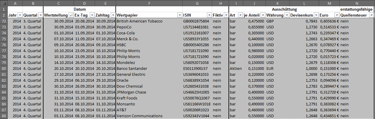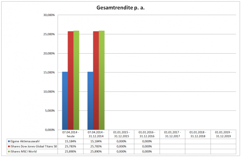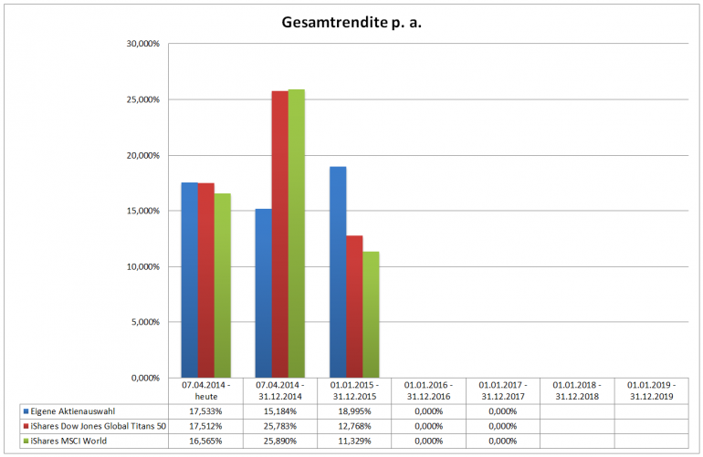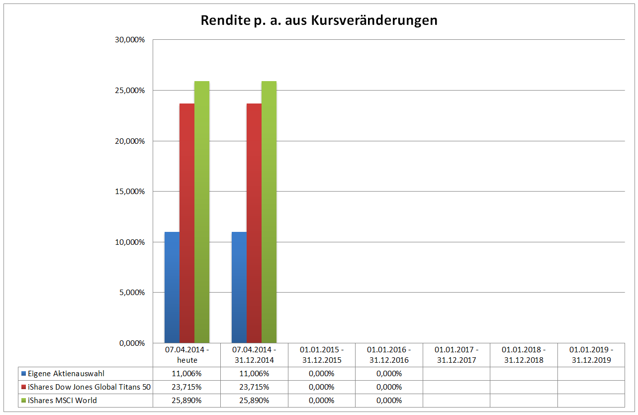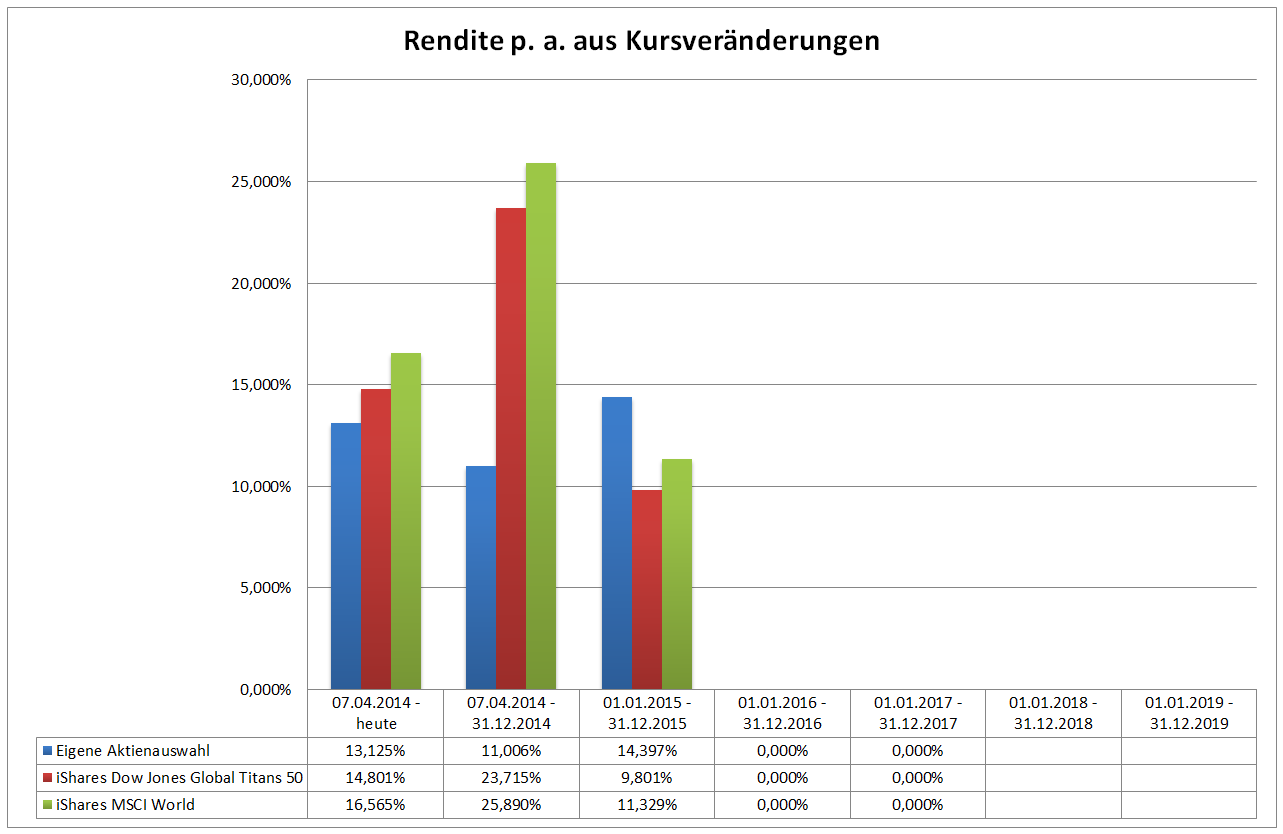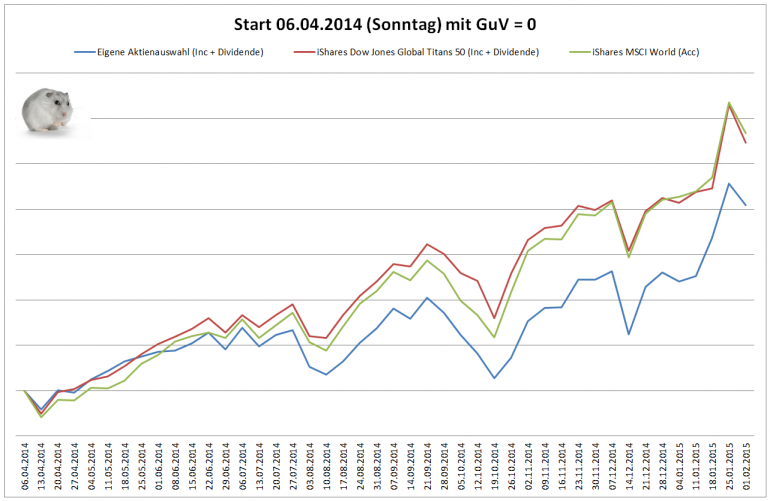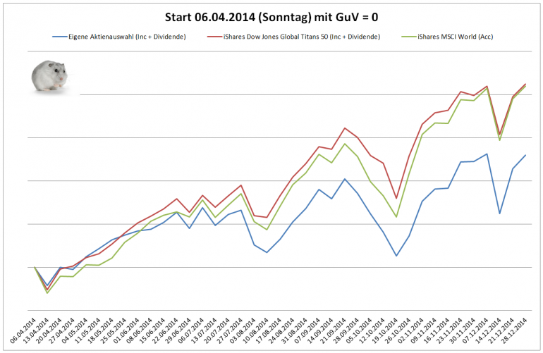 Hamsterrad Dezember 30, 2014 · bearbeitet Februar 23, 2015 von Hamsterrad Spoiler zwecks Übersichtlichkeit eingefügt Monatlicher Bericht (2014-12) Dividenden seit dem letzten Bericht: Zukäufe seit dem letzten Bericht: Syngenta IBM Telefonica (Stockdividende) Aktuelle Gewichtung und Zukäufe Unternehmen: Aktuelle Gewichtung Branchen / Sektoren / Länder / Währungen: Aktuelle Gewichtung je Branche: Übersicht mit Kennzahlen: Performance seit Auflegung inkl. Vergleichsindexes: Aktuelle GuV Unternehmen + Vergleichsindexes: Diesen Beitrag teilen Link zum Beitrag
