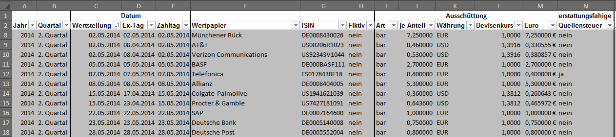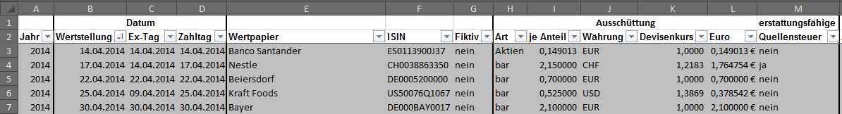 Hamsterrad Mai 31, 2014 · bearbeitet Februar 23, 2015 von Hamsterrad Spoiler zwecks Übersichtlichkeit eingefügt Monatlicher Bericht (2014-05) Dividenden seit dem letzten Bericht: Zukäufe seit dem letzten Bericht: Banco Santander (Stockdividende) Aktuelle Gewichtung und Zukäufe Unternehmen: Aktuelle Gewichtung Branchen / Länder / Währungen: Aktuelle Gewichtung je Branche: Übersicht mit Kennzahlen: Performance seit Auflegung inkl. Vergleichsindexes: Aktuelle GuV Unternehmen: Diesen Beitrag teilen Link zum Beitrag