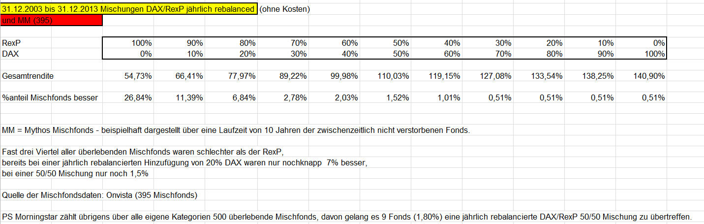 otto03 Mai 20, 2014 Ah, okay. Morningstar also nicht. Wobei - zum Teil mittlerweile wohl schon, zumindest deren US-Seite. Auch beim dt. Fondsmarkt haben sie es zumindest bei einem Artikel von vor zwei Jahren berücksichtigt: Um die Entwicklung der Fondskosten am Fondsmarkt in Deutschland einzuschätzen, haben wir die laufenden Kosten von Publikumsfonds unter die Lupe genommen. [...] Mit eingeflossen sind auch die Daten liquidierter und fusionierter Fonds, um den so genannten „Survivorship Bias“ zu vermeiden und so ein möglichst realistisches Bild des Gesamtmarkts zu vermitteln. Aber .... Auch S&P Fondsranking berücksichtigt diese Vorgänge nicht. Doch. Die gute Methodik ist gerade der Clou bei den S&P SPIVAs. Siehe S.2 in der SPIVA US von Ende 2013: • Survivorship bias correction: Many funds might be liquidated or merged during a period of study. However, for someone making an investment decision at the beginning of the period, these funds are part of the opportunity set. Unlike other commonly available comparison reports, SPIVA Scorecards account for the entire opportunity set–not just the survivors–thereby eliminating survivorship bias. • Apples-to-apples comparison: Fund returns are often compared to popular benchmarks such as the S&P 500, regardless of size or style classification. SPIVA Scorecards avoid this pitfall by measuring a fund's returns against the returns of a benchmark appropriate for that particular investment category. • Asset-weighted returns: Average returns for a fund group are often calculated using only equal weighting, which results in the returns of a USD 10 billion fund affecting the average in the same manner as the returns of a USD 10 million fund. An accurate representation of how investors fared in a particular period can be ascertained by calculating weighted average returns where each fund’s return is weighted by net assets. SPIVA Scorecards show both equal- and asset-weighted averages. • Style consistency: SPIVA Scorecards measure style consistency for each style category across different time horizons. Style consistency is an important metric because style drift (the tendency of funds to diverge from their initial investment categorization) can have an impact on asset allocation decisions. • Data Cleaning: SPIVA Scorecards avoid double counting multiple share classes in all count-based calculations, using only the share class with greater assets. Since this is meant to be a scorecard for active managers, index funds, leveraged and inverse funds and other index-linked products are excluded. S&P ist jetzt ein Anbieter für die breite Öffentlichkeit, mit Webseite, schicken PDFs und so. "Drögere" akademische Auswertungen schreiben meist dabei, ob sie mit einer "survivorship-bias free database" arbeiten oder nicht. Die besseren Studien tun es. Beispiel (klick). Siehe auch die Links am Ende dieses Artikels über den Survivorship Bias. Weitere Studien zur US-Fondsperformance allgemein finden sich z.B. hier. Die Links in den [] hinter den Autorennamen führen oft direkt zum PDF auf ssrn.com oder einer Webseite mit dem Text. Wenn nicht, gibt es populäre Studien manchmal kostenlos als PDF über die normale Google-Suche: "Studientitel, Autor +pdf". Ein guter Einstiegspunkt für eine allgemeine Suche nach akademischen Titeln ist scholar.google.com. Ich selbst habe bisher nicht nach Auswertungen speziell zum dt. Fondsmarkt gesucht, deshalb kann ich nicht mit Direktlinks dienen. Nehme dir das alles ungeprüft ab. Was kann man daraus schließen? (Fast) alle kommerziellen(von der Fondsindustrie mit Werbung versehenen) und/oder interessegeleiteten Webauftritte, die sich u.a. mit Fondsvergleichen beschäftigen haben diese Klarheit eben nicht. beispielhaft: Dieser schon etwas ältere von mir vorgenommene Vergleich hätte mit Berücksichtigung der Verstorbenen sicherlich noch katastrophaler ausgesehen: Diesen Beitrag teilen Link zum Beitrag
