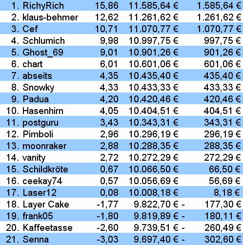 66,50 € im +. Da die Spritpreise gerade im Keller sind, werde ich das Geld an der Tanke reinvestieren. Dadurch wäre ich bei +/- 0? Egal! Dann müsst Ihr halt alle Miese machen, damit ich den Wettbewerb noch gewinne.