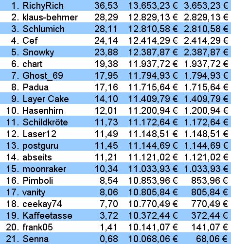 Also - realistisch wie auch unrealistisch betrachtet, unterhaltet Ihr Euch schon lange nicht mehr über den verdienten 1. platzierten.