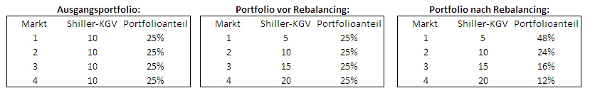 Dummbatz Mai 30, 2014 Hallo zusammen, viele von uns betreiben das klassische Rebalancing, bei dem zu einem bestimmten Zeitpunkt die ursprüngliche Asset Allocation wiederhergstellt wird. Studien haben ergeben, dass dieses Verfahren zu langfristig besseren Ergbenissen führt. Bisher sind mir keine Konzepte bekannt, die beim Rebalancing fundamentale Kenngrößen einbeziehen. Ich würde für das Rebalancing jedoch nicht die Entwicklung der jeweiligen Indizes heranziehen, sondern deren Bewertung anhand des Shiller-KGVs. Unten sieht man ein extrem vereinfachtes Beispiel: Was haltet ihr von einem derarten Vorgehen? Danke für Kritik Diesen Beitrag teilen Link zum Beitrag