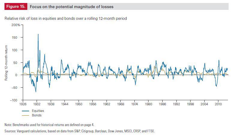 Sapine Juni 1, 2014 Ein Beispiel, was auf Sicht von 10+ Jahren an Prognose realistisch ist. Aus einem PDF für US-Anleger, daher 70% US-Anteil bei den Aktien. Dabei kommt keine exakte Zahl heraus, nur Szenarien mit breiter Streuung der Renditen: Ich bin mir nicht sicher ob ich das zweite Bild richtig verstehe. Das Shiller KGV wird in Quintile eingeteilt und der aktuelle Wert ist im obersten Quintil (vermutlich an der Grenze zum zweiten Quantil?). Für das oberste Quintil wird nun die Spanne der historischen 10Jahresrenditen (inflationsbereinigt) angezeigt. Ist das so richtig? Bei der ersten Abbildung hingegen wird in Abhängigkeit vom Shiller KGV dargestellt, wie sich die Renditen verteilen, die allerdings nicht inflationsbereinigt? Hat zwar nicht unbedingt was mit Shiller-KGV zu tun, aber die Grafik fand ich auch ganz interessant, wie die 12-monatigen Gewinne/Verluste sich bei Bonds und Aktien entwickeln. Die großen Krisen kann man hier viel deutlicher erkennen und auch in ihrem Ausmaß als bei den sonst üblichen Darstellungen. Daneben erkennt man natürlich auch, um wie viel riskanter Aktienanlagen sind im Vergleich zu Bonds. Natürlich wieder alles mit der US-Brille auf Dollarbasis. Diesen Beitrag teilen Link zum Beitrag