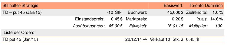 H.B. Dezember 25, 2014 · bearbeitet Dezember 25, 2014 von H.B. Hi, insbesondere beim Dividendenthema bieten sich in meinen Augen Puts geradezu an. Ich bastel mir da gerade eine Strategie zusammen. Während man bei CC's immer mit dem Risiko einer Ausbuchung konfrontiert ist, passiert das beim verkauften Put garantiert nicht. Im Gegenheit: man kann meist innerhalb kurzer Zeit die Dividende in Form der Optionsprämie manchmal sogar steuerlich optimiert vereinnahmen. Ich hab jetzt beispielsweise einen Put auf die TorontoDominion geschrieben. Die Aktie schüttet am 2.1. 0,47ct aus. Der Put bringt 0,45ct innerhalb von 3 Wochen. 2$ (oder 5%) Downsideprotection sind auch noch dabei... Das Ziel ist (wie bei CC's) eine recht sichere Vereinnahmung der Prämie, deshalb kann man den Trade auch kreditfinanziert aufsetzen. Diesen Beitrag teilen Link zum Beitrag
