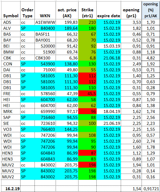 driller Februar 13, 2017 ich stellte heute die Frage, wieviel Prämien erhalte ich beim Schreiben von covered calls von aufgelisteten DAX30 Basiswerten mit Laufzeit bis 17.2.17. Antwort wäre entweder 5 oder 10 Kontrakte mit aufgelisteten Basiswerten und 1.75 % Prämie in 5 Tagen. Kontrakte werden entweder ausgeübt oder Basiswerte bleiben im Depot für weitere covered calls. Bei Fragen bitte posten oder email. Diesen Beitrag teilen Link zum Beitrag