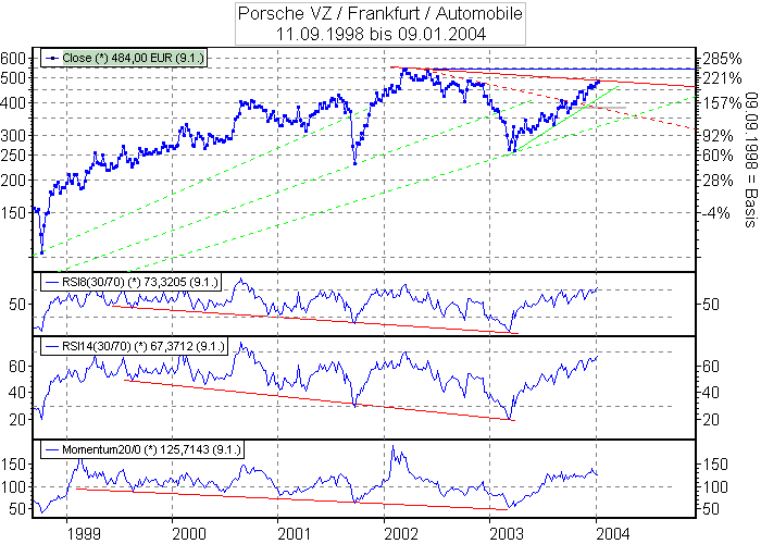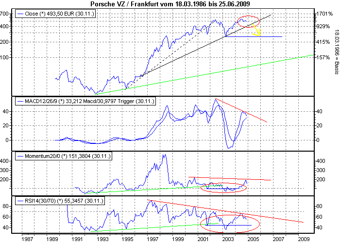 Die Porsche Aktie leckte schon am Höchststand im April 2004, konnte ihn aber nicht signifikant nach oben durchbrechen.