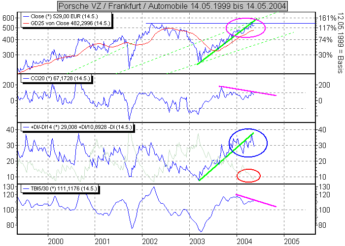 CCI und TBI scheinen die ersten neg. Divergenzen (violett) auszubilden und beginnen trotz Kurssteigerung schon zu sinken.