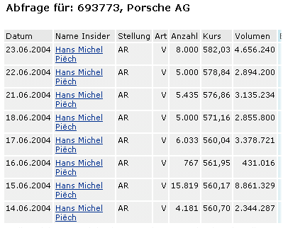 In dieser Woche gab es eine Nachmeldung von Aktienverkäufe. Besonders gewaltig war die Summe bei Porsche. Das AR-Mitglied Hans Michel Piëch trennt sich von 50.235 Aktien im Wert von 28.556.827,- .