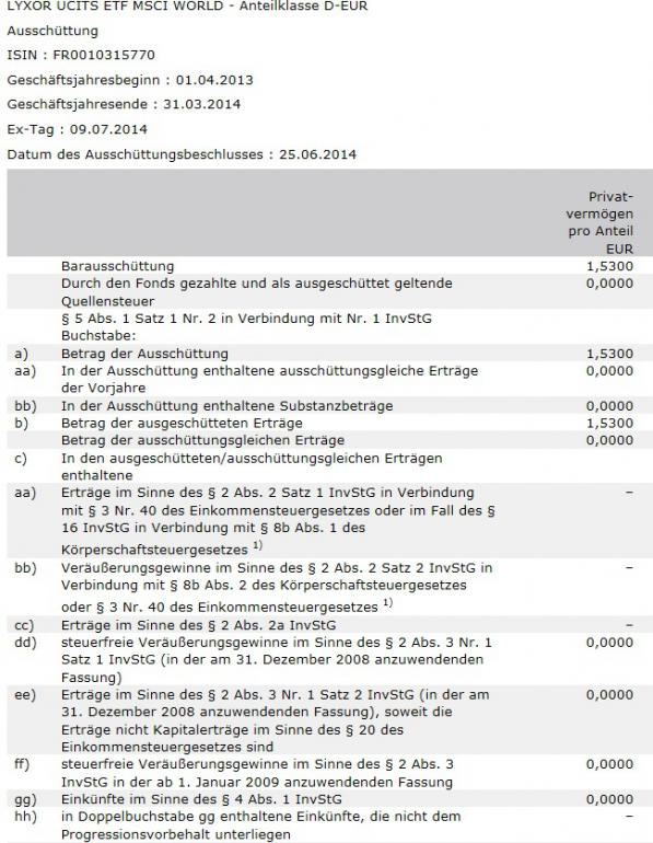 holzhacker Juli 1, 2014 Vorschlag an lowecurt : Vielleicht könntest Du die Anmerkungen #2 u. #3 noch in #1 hineineditieren. Dann wärs ein runderes Paket. Ich stimme troi65 hier voll und ganz zu. Im Prinzip ist oben bereits alles gesagt, deine Bebilderung ist aus meiner Sicht aber irreführend. Beim iShares Fonds zeigst du die Daten einer Zwischenausschüttung. Diese sind aber irrelevant. Relevant ist - wie bereits weiter oben erwähnt - die Thesaurierung zum Geschäftsjahresende! Dort sieht man dann in der Tat das der Fonds "steuerhässlich" ist, nicht jedoch an dem von dir hochgeladenen Screenshot der Zwischenausschüttung. Diesen Beitrag teilen Link zum Beitrag