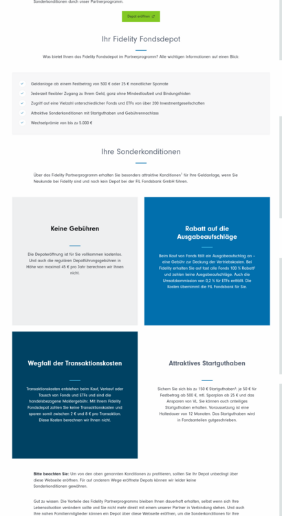 Gast260614 November 9, 2023 Also ich hab den Antrag mal durchgemacht. Beim Antrag selber findet man noch nichts zum VL-Depot und dem Mindestbetrag. Sieht man das erst nach dem Post-Ident und bei der Anmeldung? Antrag sieht aktuell so aus: Zitat Angehakt Fidelity FondsdepotPlus zur Abwicklung von Wertpapiergeschäften in Investmentfondsanteilen in Verbindung mit einem Abwicklungskonto. Nicht Angehakt Fidelity Fondsdepot zur Abwicklung von Wertpapiergeschäften in Investmentfondsanteilen. Bei der Anlage handelt es sich um Gelder des Privatvermögens. Als Anmerkung steht noch DepotRabatt 100% TauschRabatt 100% Diesen Beitrag teilen Link zum Beitrag