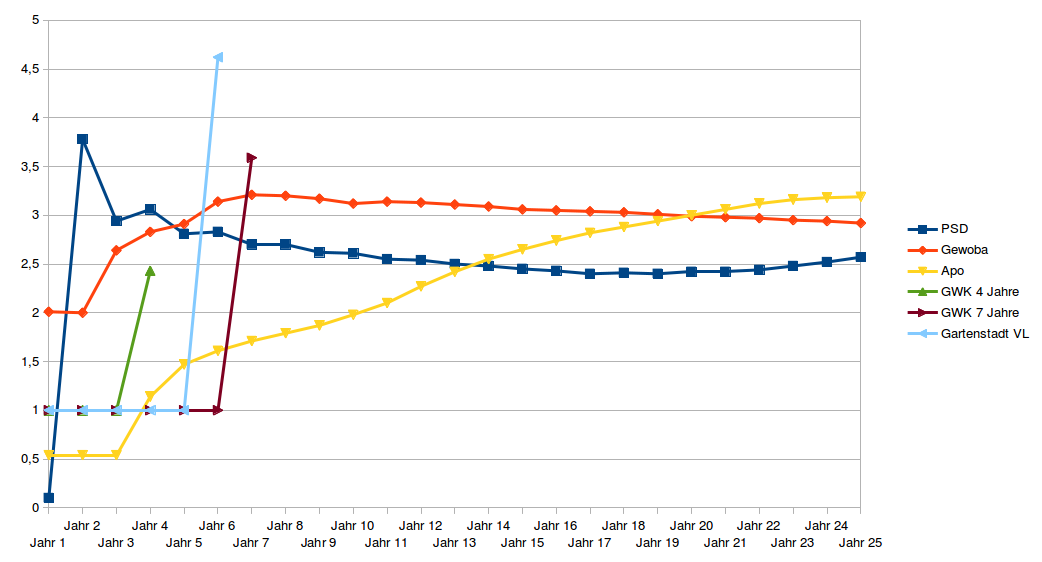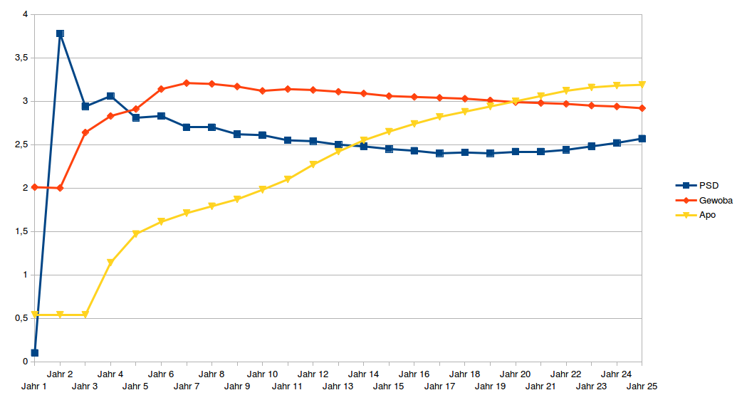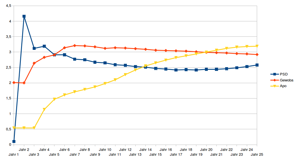 IRRer-Zins Juni 8, 2016 Hi IRRer Zins, vollkommen richtig. Der PSD rentiert besser. Hatte anstatt 6 Monate aussetzen nur 5 Monate drin. Die Genossenschaftsanteile halte ich für nicht groß nachteilig, weil wie Du schon geschrieben hast auch diese ausschütten. Vll hast Du ja Lust und Laune es hier genauer zu veröffentlichen. Ich kann es leider nicht besser. Hier nochmals den PSD mit 6 Monate aussetzen. Das wird schwer möglich, da bei einer Gesamtbetrachtung die Erträge aus den Genossenschaftsanteilen geschätzt werden müssen. Einfach die Annahme hinzufügen, dass die Genossenschaftsanteile und die Fixkosten für die Aufnahme in der Rechnung nicht berücksichtigt werden. Wenn die Fixkosten für die Genossenschaftsaufnahme eingerechnet werden sollen, würde sich in dem Diagramm eine Fläche statt einer Kurve ergeben, aus der man seine Rendite nach der monatlichen Rate ablesen müsste. Viel Arbeit für recht wenig Nutzen, da noch ein Gitter eingefügt werden müsste und die Gesamtinvestition noch nicht vollständig erfasst ist. Der wahre Sparplanfreund rechnet selbst nach; mit individuellen Randbedingungen aus der persönlichen Situation. Diesen Beitrag teilen Link zum Beitrag