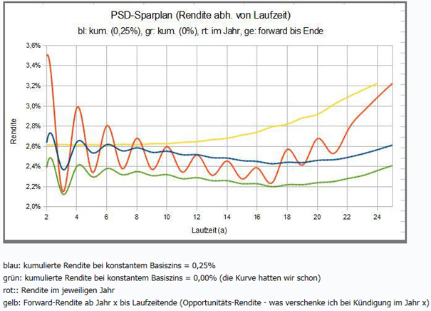 IRRer-Zins Mai 30, 2023 Am 5.5.2023 um 09:38 von BigSpender09: Sollte die Anpassung des var. Zinssatzes von 0,01% auf 2,01% erfolgen, würde das Ganze sich wie folgt entwickeln. Ich habe mal Jahr 9 als das Jahr genommen in dem die Anpassung stattfindet wird. Du musst einen neuen Zahlungsstrom mit dem aktuellen Sparplanwert sowie den laufenden Einzahlungen machen, um eine aussagekräftige Renditeangabe zur aktuellen Entscheidungssituation zu bekommen. Deine Berechnungen sind nicht hilfreich, da du als Zeitbasis der Zinsberechnung den Sparplanstart hast. Wenn man noch die Grundlage der von der PSD referenzierten Zeitreihe nimmt (BBSIS.M.I.ZST.ZI.EUR.S1311.B.A604.R03XX.R.A.A._Z._Z.A) und dann die persönlich bzw. vom Markt erwartete Zinsentwicklung extrapoliert, wird klar, dass voraussichtlich frühestens Mitte nächstes Jahr der rollierende Zinssatz über 2% klettern wird. Zinsanpassungsklausel ist mMn ein Floor aus MAX (3y-BUND rollierend -200bp und 0,01%), sonst würde im Vertragstext "auf den Referenzzinssatz zu erhöhen" stehen. Fazit: Habe meine PSD Sparpläne und die im Umfeld zum September gekündigt, da aktuell und zukünftig ggü. gleichartigen Alternativen unattraktiv. Ein kleiner Teil läuft noch bis nächstes Jahr April. Diesen Beitrag teilen Link zum Beitrag