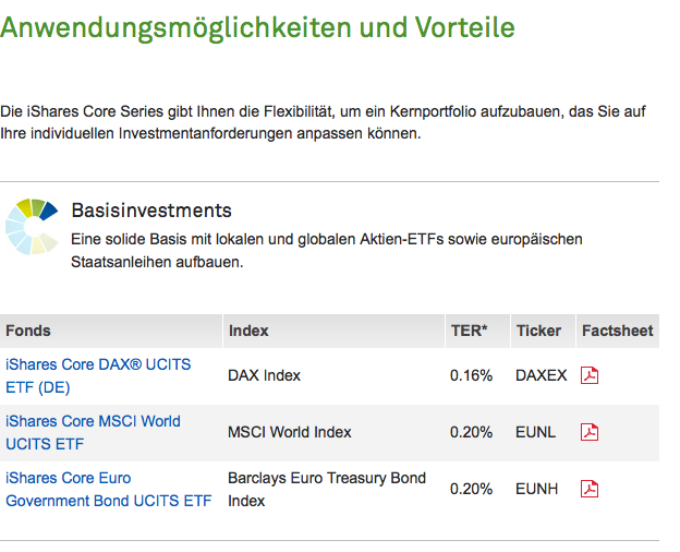 NoNameMD August 7, 2014 · bearbeitet August 7, 2014 von NoNameMD Okay, konkreter: Da ihr mir ja zu ETFs geraten habt, habe ich mich ein wenig intensiver damit auseinander gesetzt und geschaut welche ETFs es so gibt. Und das sind wahrlich eine Menge. Dann habe ich mir die 70/30- und die 30/30/30/10-Strategien angesehen und letztere sagte mir eher zu. Daher habe ich geschaut, welche passenden ETFs meine Depotbank anbietet, bin auf die iShares CORE-Fonds gestoßen, hab sie gegoogelt und bin auf o.g. Seite gekommen. Leider hat Google aber keine Meinungen dazu ausgespuckt, wie "gut" oder "schlecht" diese Produkte/ein Depot aus diesen Produkten ist. Daher meine Frage: Was haltet ihr davon, ein Depot aus diesen Bausteinen aufzubauen? Und wenn ihr es für sinnvoll haltet: Wie würdet ihr welchen Baustein gewichten Ergänzung: Mit gefällt halt, dass man mit den Bausteinen nicht nur "Welt" und "Europa" pauschal im Depot hat, sondern auch etwas gezielter gewichten kann. Und Staats- und Bundesanleihen finde ich eine nette "Abrundung". Diesen Beitrag teilen Link zum Beitrag