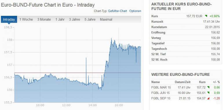 Heute haben wir mit dem Ende der Kopplung des Schweizer Franken an den Euro und damit einhergehend mit der Absenkung des Zinssatzes der Schweizer Nationalbank ( SNB ) auf -0,75 % eine fundamental neue Situation. Der Bundfuture erreichte mit 157,69 ein neues ATH ! Die schon zuletzt mickrigen Zinsen in Euroland geben weiter nach !
