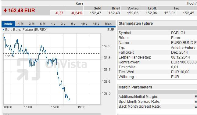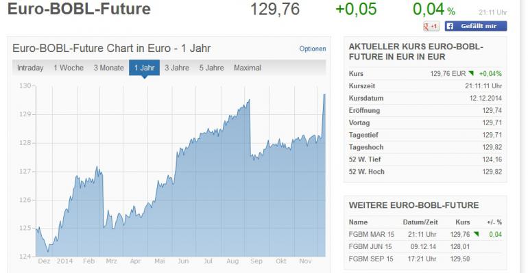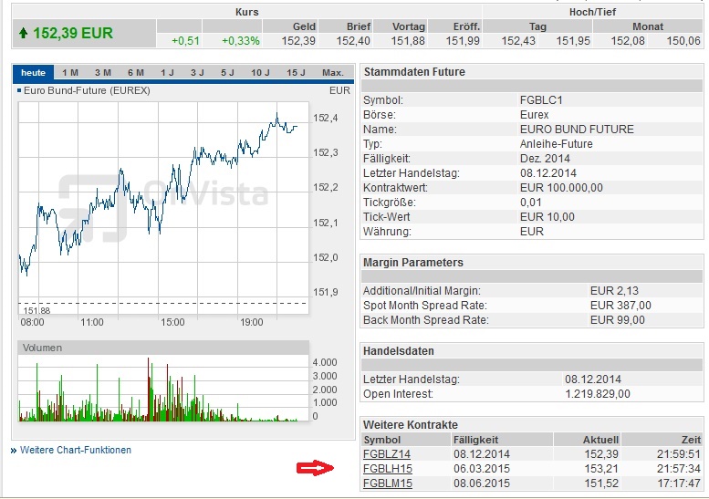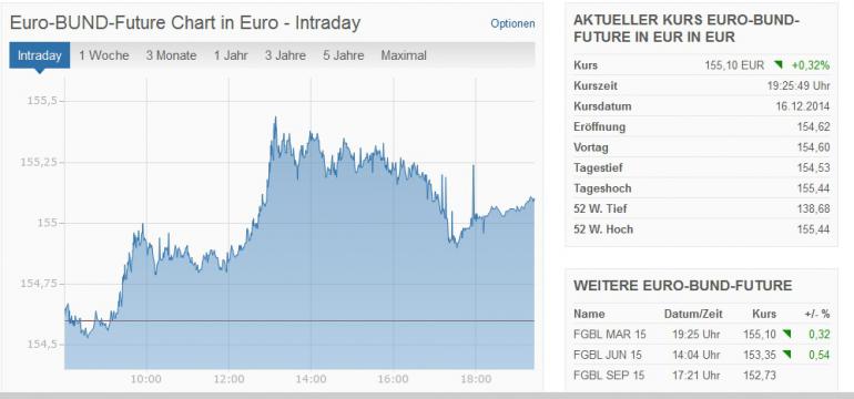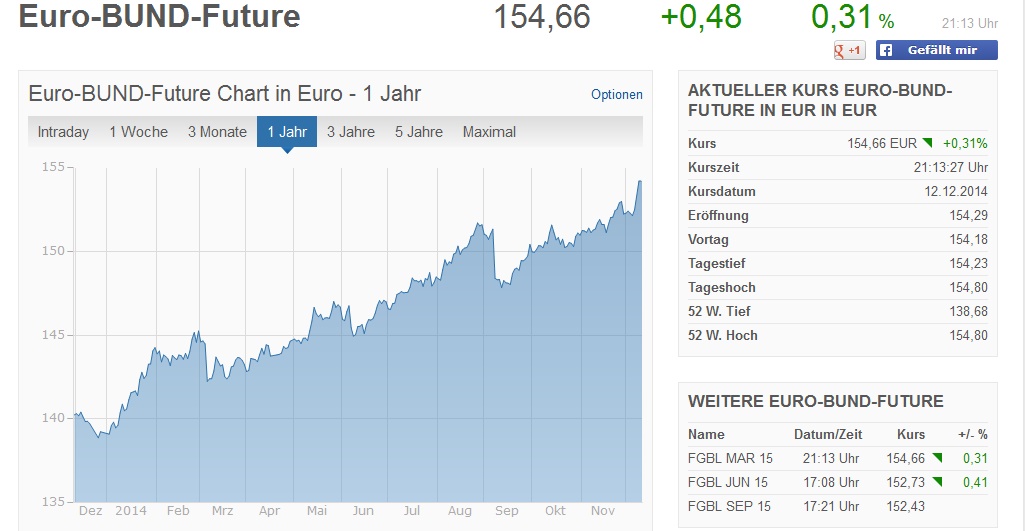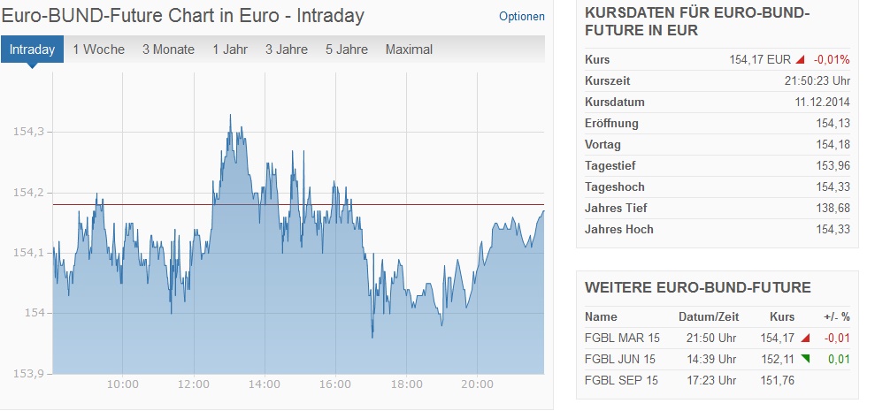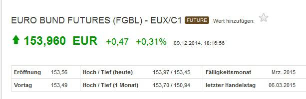 Heute war der letzte Handelstag des Bundfuture mit Fälligkeit vom 8. Dez.. 2014. Er endete mit 152,45. Der Bundfuture mit Fälligkeit 6. März 2015 hatte heute ein neues ATH bei 153,6 erreicht: