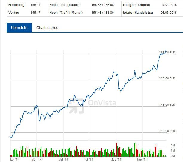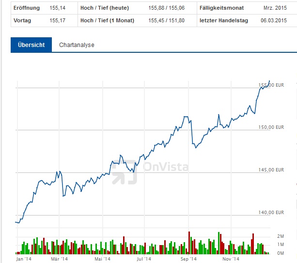 Das Jahresende bescherte dem Bundfuture ein neues Rekordhoch bei 155,88, Schlusskurs war 155,75. Im Jahreschart 2014 sieht das so aus: