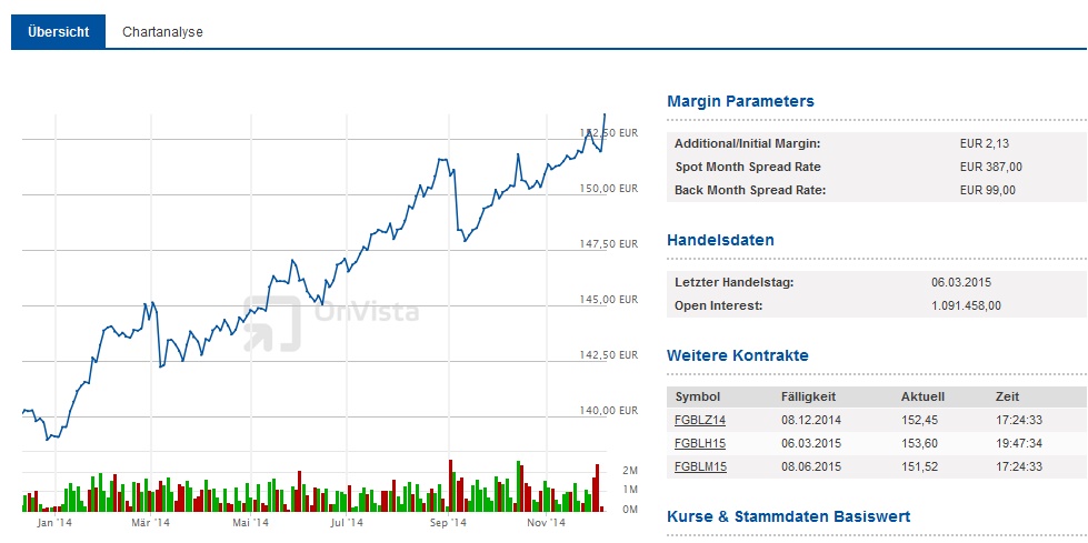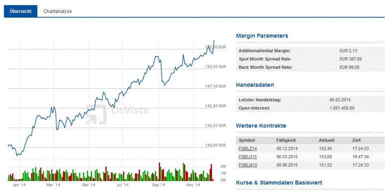 Heute fehlten nur 6 Ticks zum ATH vom 15.10.2014. Der Kontrakt läuft am 8.12. aus. Der Kontrakt FGBLH15 mit Fälligkeit am 06.03.2015 wird bereits mit 153,21 gehandelt.
