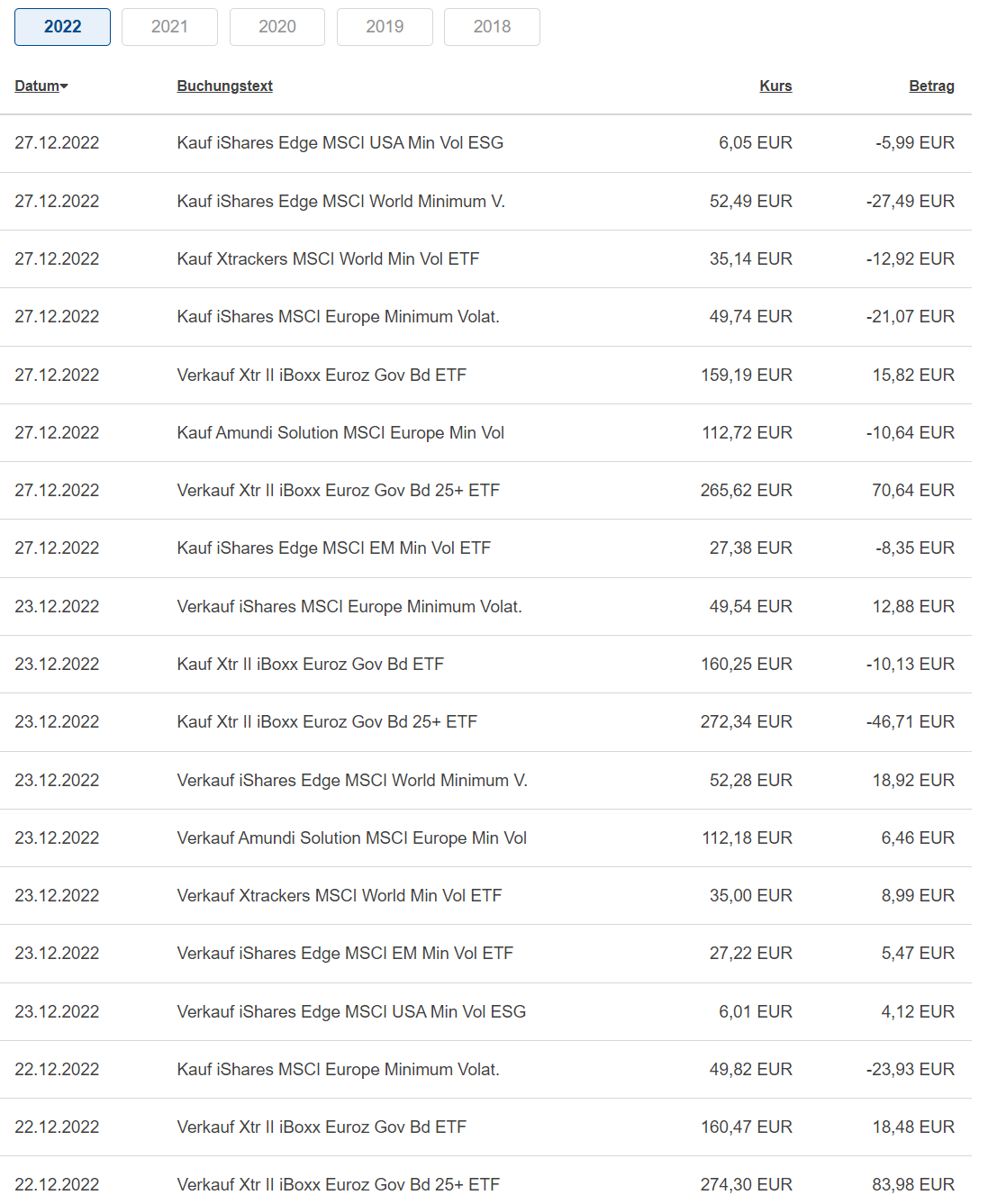 Allesverwerter Dezember 28, 2022 Bei mir sind nur noch halbjährlich Transaktionen. Im Dezember wurde leicht zu Lasten MSCI zu Gunsten Bonds 25Jahre+ umgeschichtet. Wenn sie damit >50% Wertverlust aufholen, Hut ab Diesen Beitrag teilen Link zum Beitrag