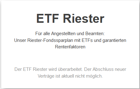 Matunus April 14, 2021 vor 14 Stunden von ecostream: Bin mal gespannt, was jetzt mit den bereits bestehenden Verträgen passiert. Kommuniziert haben die nämlich - mal wieder - nix. Es muss sich nicht zwingend etwas ändern für Bestandskunden. Vielleicht werden nur die Bedingungen für Neukunden geändert (andere Kostenstruktur, ggf. keine eingehenden Überträge mehr o.ä.). vor 2 Stunden von maso: Im raisin-pension.de Cockpit wird mein Riester aktuell nicht mehr angezeigt. Die Übersichtsseite lädt bei mir einfach gar nicht fertig, aber unter Produkte ist der ETF-Riester mit allen aktuellen Daten noch da. Würde ich nicht überinterpretieren, wahrscheinlich nur ein technischer Fehler. Diesen Beitrag teilen Link zum Beitrag