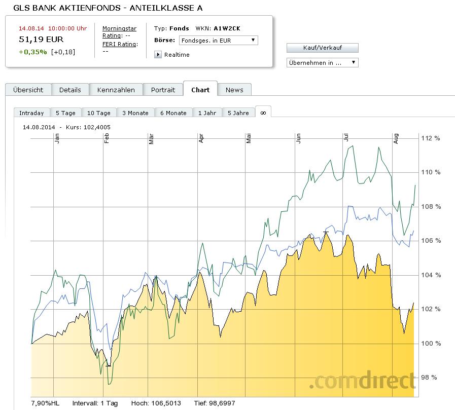 FReak950 August 16, 2014 Wenn ich lese "Verluste werden ausgesessen" und "Anlagehorizont 8 Jahre bis Immobilienkauf" so zweifele ich, ob das zusammen passt. Aber das ist m.E. nur ein Problem. Der GLS-Fonds hat z. B. eine große Position in Drägerwerk und die beliefern Ölindustrie, Chemieindustrie und US Marine Corps. Das ist eine etwas eigenwillige Auswahl von ökologischem Gutmenscheninvestment. Notfalls wird der Immobilienkauf eben später getätigt, eine Not eine Immobilie zu kaufen werde ich nicht haben, aber aktueller Horizont ist, dass das in den nächsten 8 Jahren auf keinen Fall passiert, danach dann evtl. So war das gemeint... Ja da magst du recht haben, wede mich aber trotzdem auf die Auswahl des Fondsmanagements verlassen. Danke aber für den Hinweis! Diesen Beitrag teilen Link zum Beitrag