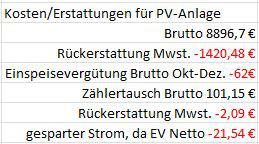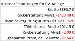chart Januar 10, 2015 · bearbeitet Januar 11, 2015 von chart Auch hier mal ein Update. Das sind noch die Zahlen zu der Tabelle Amortisierung PV-Anlage. Von den 62€ die ich vom EVU (Energieversorgungsunternehmen) erhalten habe, muss ich die Mwst. an das Finanzamt zahlen, dann muss ich noch Mwst. für den Eigenverbrauch zahlen, von den 101€ die ich bezahlt habe, bekomme ich die Mwst. wieder. Das Finanzamt hatt es verrechnet, so dass ich vom Finanzamt 2,09 € zurück bekommen habe. Diesen Beitrag teilen Link zum Beitrag