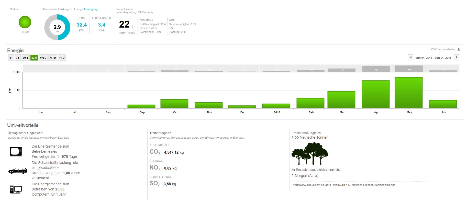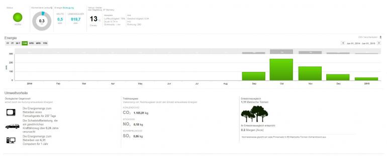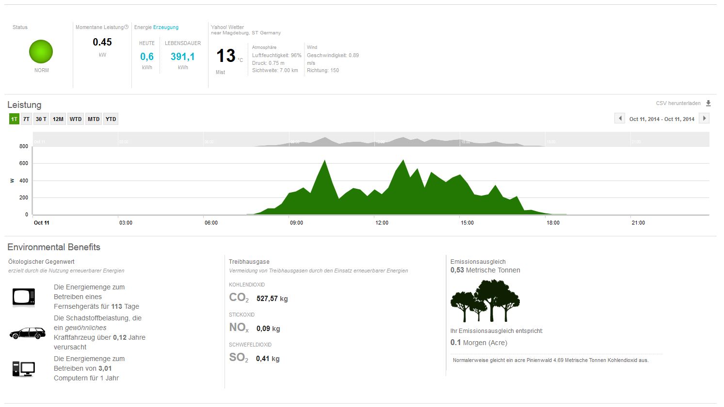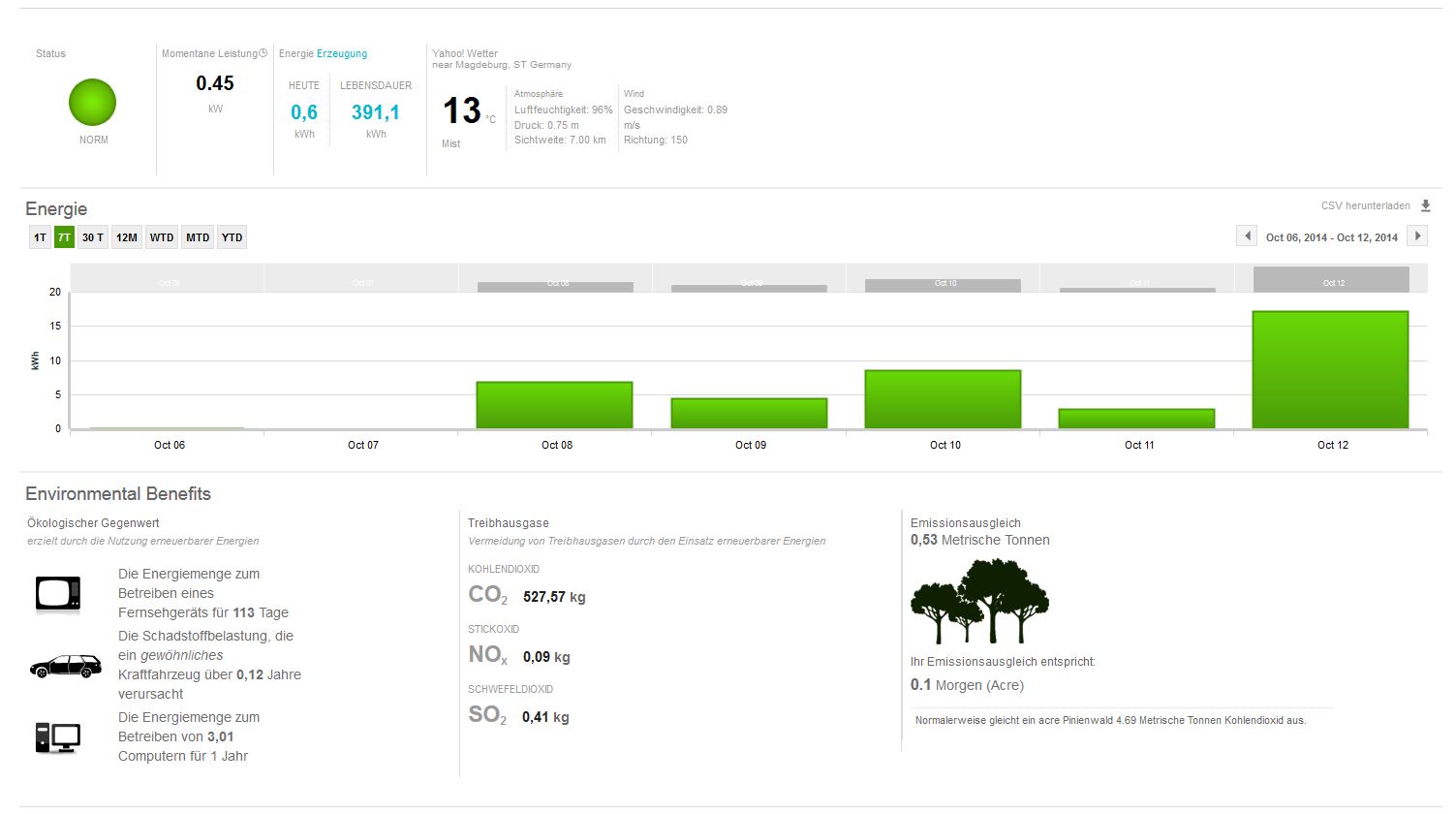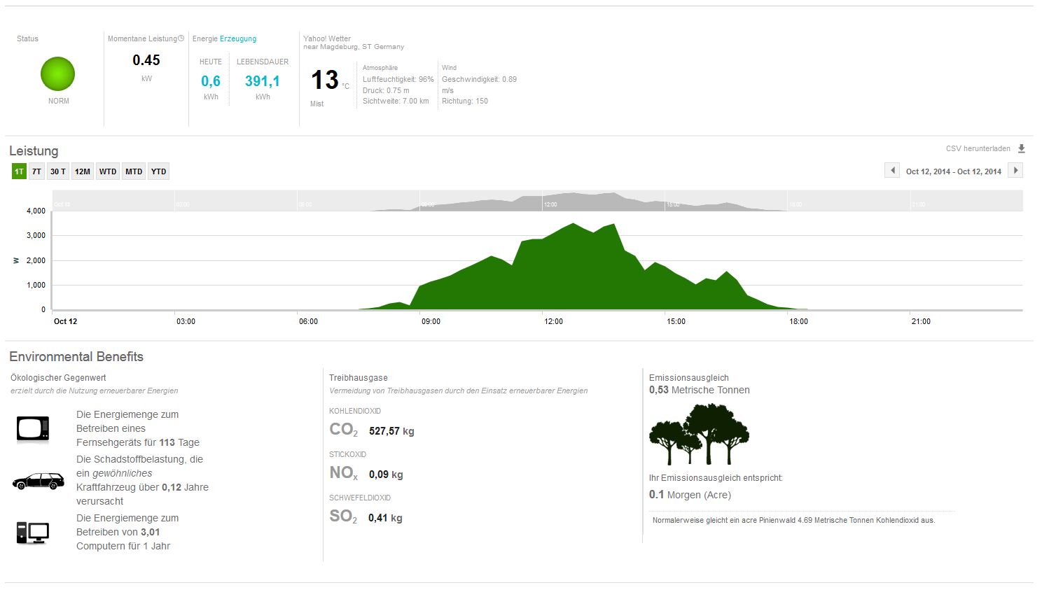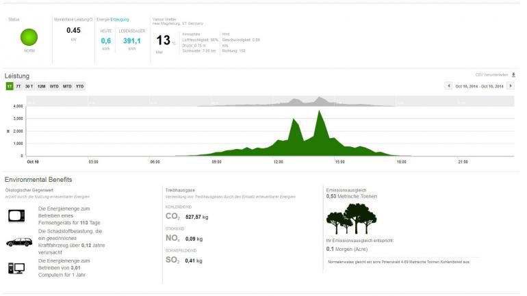 chart Oktober 13, 2014 @lenzelott Versicherung fällt bei mir weg, meine Wohngebäudeversicherung deckt sämtliche elektrische Anlagen inkl. PV mit ab. Was für Instandhaltungskosten auf mich zukommen weiß ich nicht, die Anlage sollte recht wartungsarm sein. Vielleicht mache ich doch nur eine Exceltabelle. Den Stromanbieter werde ich wie bisher jedes Jahr wechseln. So nehme ich immer den Neukundenbonus mit. Ab nächstem Jahr sollte ich dann von bisher 54€ monatlich auf etwa 35-40 € monatliche Stromkosten kommen. Bei einem Verbrauch von ca. 2000 kWh Durch den Bonus komme ich dann auf 21-22 Cent/kWh. Dann kommt ja noch die Einspeisevergütung hinzu. Seit einigen Tagen funktioniert der Datenlogger nun endlich. Leider gab es einige Probleme mit der Datenübertragung, aber ABB hat es nun hinbekommen. Hier mal einige Bilder. Hier sieht man was die Anlage seit dem 8.10.14 pro Tag geliefert hat. Man kann gut erkennen, dass es recht stark bewölkt war. Bis auf den 12.10., da hat die Sonne sich recht lange gezeigt, dementsprechend wurde auch einiges mehr an Strom produziert. Auch an diesem Tag war es recht bewölt, an den 2 Spitzen kann man gut erkennen, dass sich die Sonne doch mal kurz gezeigt hat. An diesem Tag hat sich die Sonne leider gar nicht gezeigt, trotzdem hat die Anlage 2,87 kWh an dem Tag produziert. Es ist zwar nicht viel, aber besser als nichts. So sieht es auch wenn es mal ein schöner Tag im Oktober ist. Wäre es Juni oder Juli, hätte die Anlage noch einiges mehr produziert. Denn die Sonne steht jetzt schon recht flach und die Tage sind auch nicht mehr so lang. Diesen Beitrag teilen Link zum Beitrag