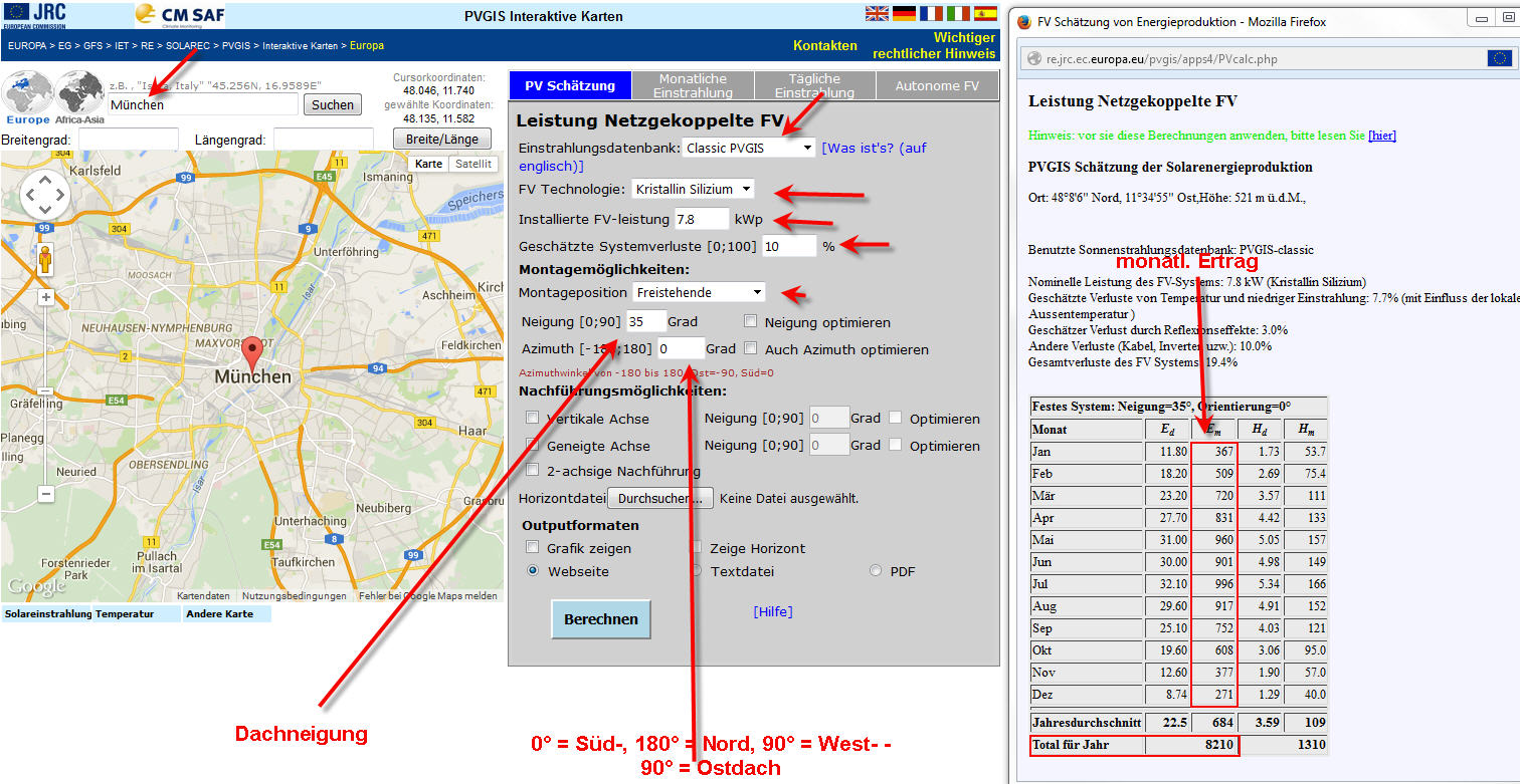 Holgerli August 19, 2015 Nachtrag: Wenn Du Dich fragst was bei PVGIS der Unterschied zwischen „PVGIS Classic“ und „ClimateSAF“ ist, dann ist das ganz einfach gesagt die Erfassungsart. ClimateSAF ist eher Satellit und neuer PVGIS Classic eher bodengestützt und was älter. Von den Erträgen unterscheiden sich beide um 10 bis 20% je nach Region. Wenn Du Classic nimmst hast Du eine realistische aber recht konservative Ertragsprognose. Wenn Dein Solarteur da noch drunter ist, solltest Du ihn fragen warum. ClimateSAF ist eher das obere Ende des Möglichen. Mit harten 70% nur sehr, sehr schwer erreichbar. Wenn Dein Solarteur da drüber ist, kannst Du das Angebot m.M.n. in den Müll schmeißen, da absolut schöngerechnet. Die 10 Prozent Systemverluste sind Erfahrungswerte. „Freistehend“ deswegen, weil es auch noch Module als Dachersatz gibt. Die haben dann aber eine schlechtere Hinterlüftung und deswegen 10 Prozent weniger Ertrag. „Freistehend“ ist daher die Wahl, wenn die Module auf das Dach per Untergestellt kommen. Diesen Beitrag teilen Link zum Beitrag
