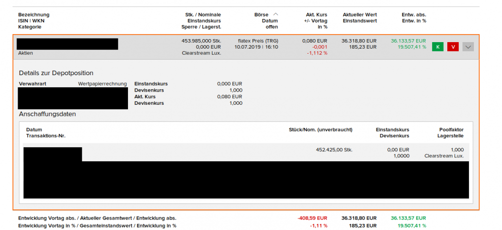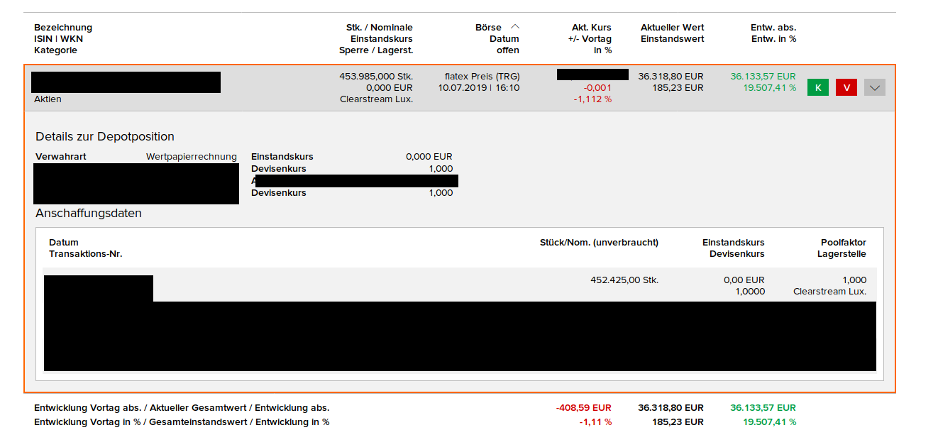 Wertpapiernoob Juli 10, 2019 vor einer Stunde von JimmyGemini: Kann sein, dass ich es falsch verstehe, aber hier mal das Resultat meines Depotübertrags von Degiro zu Flatex: 19507 % Gewinn klingt mir nicht vielversprechend. Einstandskurs 0.00 € Ich denke das dies stimmen wird. Es ist nämlich so dass nur bei inländischen Wertpapierüberträgen eine automatische Steuerrelevante Einstandsdatenübertragung (Textbox-Verfahren) stattfindet. Da Degiro ein ausländischer Broker ist findet dies bei einen Übertrag noch einer in Deutschland ansässigen Bank nicht zwangsläufig statt. Du kannst dort aber garantiert nicht nachfragen und dies manuell ausführen lassen - dafür werden aber wahrscheinlich zusätzliche Kosten anfallen. vor 2 Stunden von Ramstein: Bei Deutsche Bank maxblue hast du die Handelsplätze und die Steuer inklusive Quellensteuer für viele Länder. Dafür zahlst du 0,25% Handelsgebühr. Das mit den Quellensteuern stimmt. Ist aber aufgrund meiner Gesamtdepotgröße noch nicht wirklich relevant (bei einigen Ländern ist das aber auch noch nicht relevant). Ich dachte das man bei ausländischen Handelsplätzen auch eine zusätzliche Gebühr zahlen muss? Oder meinst du "DirectTrade" ? (Und wenn ja - Wie gut ist denn dass Angebot über diesen Handelsplatz?) Diesen Beitrag teilen Link zum Beitrag