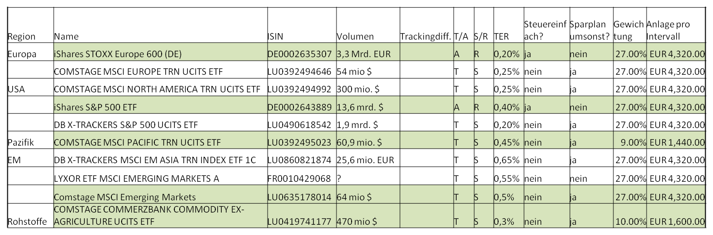 Sapine Oktober 2, 2014 Zur eindeutigen Identifizierung der Fonds wäre die Angabe der jeweiligen ISIN nicht schlecht. Der comstage MSCI EMU beschränkt sich auf Euroland und deckt damit nur einen Teil von Europa ab. In einem Weltdepot sollten GB, Schweiz und andere nicht Euro-Länder nicht fehlen. Für den S&P gibt es günstigere Alternativen, falls Du Dich bei Nordamerika auf ihn beschränken willst. Der ishares von Nordamerika gehört meines Wissens gerade nicht zu den steuereinfachen Fonds, aber war jetzt zu faul das zu verifizieren ohne ISIN. Was ist mit der o.g. Anlage in den Arero? Willst Du das weiter machen, oder wird das Geld zukünftig in das neue Weltdepot integriert? Falls Du ihn behalten willst, empfehle ich die Lektüre des entsprechenden Fadens hier im Forum. Es gibt da ein paar negative Aspekte, die man zumindest wissen sollte. Grundsätzlich solltest Du nicht nur auf die TER schauen beim Vergleich der Kosten sondern auch auf die Tracking Differenz, denn die ist letztlich entscheidend, wie "nahe" der ETF am Index klebt. Zuletzt hat comstage bei einigen ETFs die Gebühren gesenkt, wodurch man in der Zukunft bei den betroffenen Fonds mit einer niedrigeren TD rechnen kann, als die aktuell ausgewiesene. In Anbetracht eines zukünftigen Immoerwerbs ist die Beschränkung des Aktienanteils auch bei höherer Risikobereitschaft auf ein Drittel sinnvoll. Ob es zum Zeitpunkt des Erwerbs sinnvoll ist, das Depot zu behalten oder nicht, darüber streiten sich die Geister. In jedem Fall ist es ein Risiko, dass Du nur eingehen solltest, wenn Dich ein Zinsanstieg bei der Anschlußfinanzierung nicht aus der Kurve trägt. Diesen Beitrag teilen Link zum Beitrag