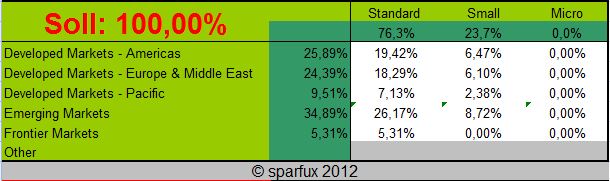 BullenichtBär Oktober 22, 2014 · bearbeitet Oktober 28, 2014 von BullenichtBär Hier also meine acht (ok, ok, 7+1) Top-Favoriten! Ist zwar insgesamt etwas ComStage lastig aber was soll's. Unten noch die Aufteilung. Nordamerika: ComStage ETF S&P 500 UCITS ETF I (LU0488316133) TER 0,12% (Swap - thesaurierend) Europa: iShares STOXX Europe 600 (DE) (DE0002635307) TER 0,20% (replizierend - ausschüttend) Pazifik: ComStage ETF MSCI Pacific TRN UCITS ETF I (LU0392495023) TER 0,45% (Swap - thesaurierend) Emerging Markets: AMUNDI ETF MSCI EMERGING MARKETS UCITS ETF - EUR (FR0010959676) TER 0,20% (Swap - thesaurierend) Frontier Markets: RBS Market Access MSCI Frontier Markets Index ETF (LU0667622202) TER 0,90% (Swap - thesaurierend) Small Caps USA: ComStage ETF MSCI USA Small Cap TRN UCITS ETF I (LU0392496005) TER 0,35% (Swap - thesaurierend) Small Caps Europa: ComStage ETF MSCI Europe Small Cap TRN UCITS ETF I (LU0392496344) TER 0,35% (Swap - thesaurierend) Small Caps Emerging Markets (und SC Pacific): SPDR MSCI Emerging Markets Small Cap UCITS ETF (IE00B48X4842) TER 0,55% (replizierend - thesaurierend) Mit einer mittleren TER von knapp unter 0,3% p.a. bei dieser Konstellation kann ich leben (Anmerkung vom 28.10.2014: hatte mich erst verrechnet, TER ist deutlich geringer als die zuvor genannten 0,37%). Aufteilung: NA 20% EU 20% PAC 10% EM 25% FM 5% SC NA 5% SC EU 5% SC EM / PAC 10% Stimmt jetzt nicht bis auf den letzten Prozentpunkt mit den BIP Verhältnissen überein, aber dafür sieht es schön aus Ach ja, nach der Lektüre einiger Rohstoff Threads hier im Forum bin ich nicht mehr wirklich von den zur Verfügung stehenden Anlagevehikeln überzeugt und lasse Rohstoff Futures darum zunächst einmal weg! Kommentare? Diesen Beitrag teilen Link zum Beitrag