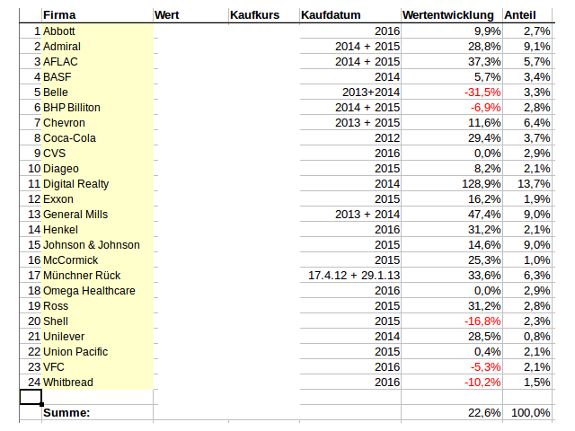 patient4711 Januar 2, 2017 Ein gesundes, erfolgreiches und glückliches 2017! Auf das eure Depots in 2017 explodieren mögen. Vom Dezember gibt es außer Dividendenerhöhungen wenig zu melden: - Abbott +1,9% - CVS +18% Mein Regelivestment habe ich vor lauter Faulheit vergessen. Das wird wahrscheinlich im Januar nachgereicht, mal vorausgesetzt die Versicherungen plündern mein Konto nicht über Gebühr... Jahresupdate 2016 Für 2016 hatte ich mir vorgenommen, nicht mehr so viel auf die Dividendenrendite zu schauen. Wies aussieht, fielen alle Neuinvestments bis auf HCP in die Kategorie - und mit HCP bin ich prompt auf die Nase gefallen. Stolz bin ich auf Henkel, denn hier habe ich den Tiefpunkt recht genau erwischt und mit 25% für diese No Brainer Kategorie ganz gut abgeschnitten. In Summe lag ich bei +14,5%. Im Vergleich zum DAX (+6,7%) und MSCI World (+10,7%) ein klares Plus. Wegen dem Depotumzug ist es einigermaßen schwierig für alle Werte die korrekten Bewegungen aufzulisten (und ich bin ehrlich gesagt auch zu faul dazu). Gezogen haben dieses Jahr definitiv die Ressourcenwerte, die alle zwischen 20% (Exxon) und 60% (Billiton) gemacht haben. Dick im Minus war dieses Jahr nur Belle - mein Sorgenkind. Fortschritte gab es bei den maximalen Depotanteilen. Die Schwergewichte GIS und JNJ sind jetzt klar unter 10%. Bei Digital Realty hatte ich gegen den schnellen Preisanstieg keine Chance. Aufstockkandidaten sind Unilever und Nike, QCP zählt hier nicht da eh Verkaufskandidat. Bei den Branchen habe ich starke Gewichtung auf Finanzen und Ressourcen, weil es hier Kaufgelegenheiten gab. Auch bei REITs habe ich anständig Depotanteil. Ausbaupotential habe ich in einigen Branchen, die bis jetzt Mr. Markets Lieblinge waren. Diesen Beitrag teilen Link zum Beitrag