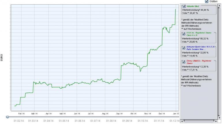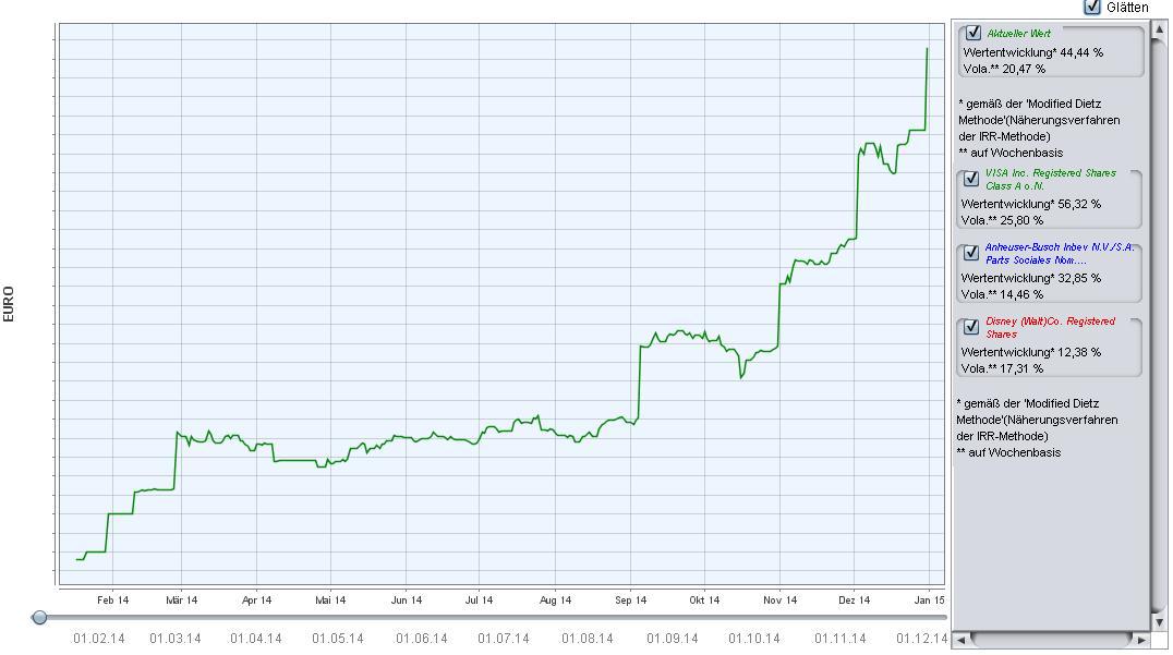 Das würde bedeuten im Jahr 2014 habe ich 44,44% bei einer Vola von 20,47% erwirtschaftet.