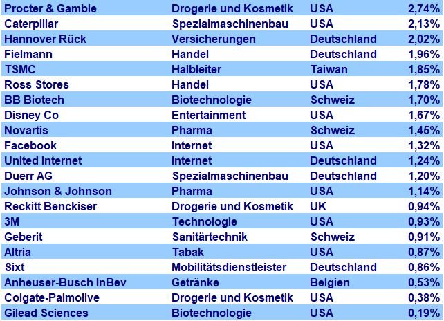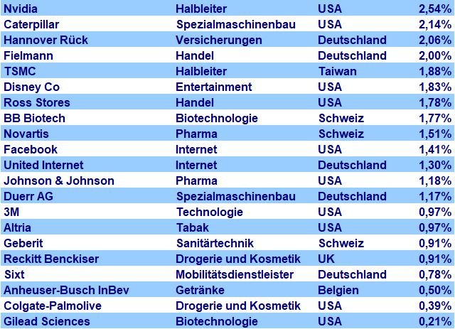 Al Bundy November 15, 2021 Hallo ghost_69, auch von mir ein herzliches Danke schön. Ich habe mir schon einige Inspirationen von deinem Depot geholt, wie zuletzt Coloplast. Da du einen neuen Wert suchst, und wir etwa die gleiche Investment-Philosophie verfolgen, möchte ich als Anregung mein Depot posten. Ist allerdings sehr US-lastig (71%). Die Nicht-US-Werte, die du noch nicht hast, wären: Weng Fine Art, KDDI, Roche und Eurofins Scientific. Vielleicht ist was für dich dabei? Diesen Beitrag teilen Link zum Beitrag