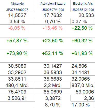 ghost_69 November 19, 2021 Am 17.11.2021 um 19:13 von ananbt: Wie wäre es mit Nintendo oder Einhell? Nintendo ist Gaming da habe ich mir zwei andere Player dazu rausgesucht, ich finde am besten steht EA da, wohl auch wegen der Online Olympics oder so etwas in der Art. Denke das ich da mit Nvidia und TSMC gut aufgestellt bin, egal welches Game gerade die Nase vorn hat. Einhell hat nur kleine Jahresüberschüsse, liegt wohl an der Pandemie, auf Dauer sollten alle genug Werkzeuge gekauft haben, da ist ein Baumarkt besser, denn der hat mehr Angebote. Ghost_69 Diesen Beitrag teilen Link zum Beitrag