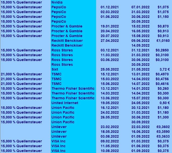 ghost_69 September 3, 2022 Am 20.8.2022 um 12:29 von Sapine: Es ist schön zu sehen, wenn ein Plan funktioniert Vielen lieben Dank Splash and Dash: ... Unilever und Visa haben ihre Dividende gezahlt ... ... im Vergleich zum letzten Jahr, liegen diese beiden Werte 30% höher, das liegt an Nachkäufen und Erhöhungen ... ... insgesamt liege ich etwas über 6% höher als im Vorjahr 2021, das schon deutlich sichtbar ist. Ghost_69 Diesen Beitrag teilen Link zum Beitrag