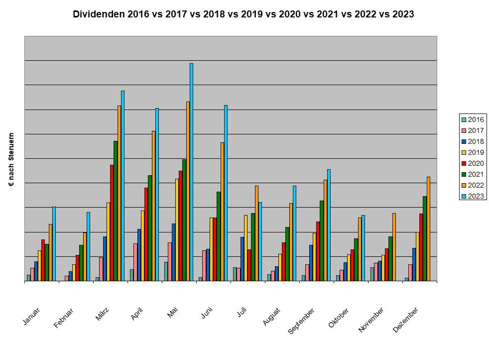 ghost_69 Oktober 15, 2023 Am 7.9.2023 um 16:40 von ghost_69: zum einen Zahlen die Unternehmen ihre Dividenden und die meisten erhöhen ihre Dividende, einige sind knausrig und zahlen nur 1 Cent mehr, der Durchschnitt erhöht um etwa 2-5% und wieder andere kommen mit 16-41% daher, also steigt das so schonmal, dann kaufe ich noch nach, dieses Jahr etwa 3% vom Depotvolumen nach, davon gibt es dann auch noch mehr und das steigert sich dann immer weiter, da ich die Dividenden immer wieder investiere. Ghost_69 vor 15 Stunden von Nachdenklich: Hallo Ghost_69, Dein Depot ist wirklich interessant zusammengestellt und ich finde es bewundernswert, wie konsequent Du hier die Entwicklung darstellst. Insofern ein Dank für Deine ausführliche Berichterstattung. Ich muß aber sagen, daß es für mich weit interessanter wäre, wenn Du nicht nur auf den Cent genau jede eingegangene Dividende vorstellen und die Steigerung des Dividendenflusses von Jahr zu Jahr darstellen würdest, sondern stattdessen auch etwas zur Rendite der Anlage mitteilen würdest. Daß die Dividenden von Jahr zu Jahr mehr werden, hat für mich wenig Aussagekraft, wenn nicht dazu berichtet wird, in welchem Ausmaß das auf neue, zusätzliche Investitionen zurückzuführen ist. Der Bericht über jede einzelne Dividendenzahlung wäre informativer, wenn Du dazu auch offenlegen würdest, zu welchem Kurs (Durchschnittskaufkurs) Du die Aktien erworben hast und welche Rendite Du mit diesen Dividenden auf den gegenwärtigen und/oder auf den Kaufkurs erhältst. Solche Angaben fände ich sowohl in Bezug auf die einzelnen Positionen als auch auf das Gesamtdepot interessant. Ich bin mal an den Anfang des Fadens gesprungen. 2014/15 hast Du solche Angaben noch gemacht, später dann nicht mehr. Nun habe ich nicht alle 57 Seiten durchgesehen, um zu suchen, ob es irgendwo eine Erklärung dafür gibt, ich möchte Dir aber dennoch gerne schreiben, daß ich Deine Präsentationen noch deutlich interessanter fände, wenn nicht nur die Ergebnisse (Dividendenzahlungen an Dich) sondern auch die Einzahlungen [natürlich nicht in konkreten Eurobeträgen sondern in Relation zu den Ergebnissen] dargestellt würden. Verstehe mich bitte nicht falsch. Ich gehöre nicht zu denjenigen, die an einer Orientierung an Dividenden herummäkeln. Aber ohne Bezug zur Investitionssumme hat die Dividendensumme für mich keine Bedeutung. Danke für Dein Interesse. Die Durchschnittskaufkurse habe ich, ist nur mehr Arbeit. Da ich 2013 damit angefangen habe, wußte ich noch nicht wohin die Reise ging, daher am Anfang eher mehr Daten. Oben im Zitat von mir, habe ich geschrieben, dass ich dieses Jahr etwa 3% nachkaufe und die Dividende von etwa 1,8% kommt dazu, wobei die Nachkäufe von Jahr zu Jahr prozentual weniger werden. Die Rendite ist immer in den Downloads vorhanden. aktuell bin ich bei 1 Jahr bei einer Rendite von 17,25% bei einer Vola von 8,2% Ghost_69 Diesen Beitrag teilen Link zum Beitrag