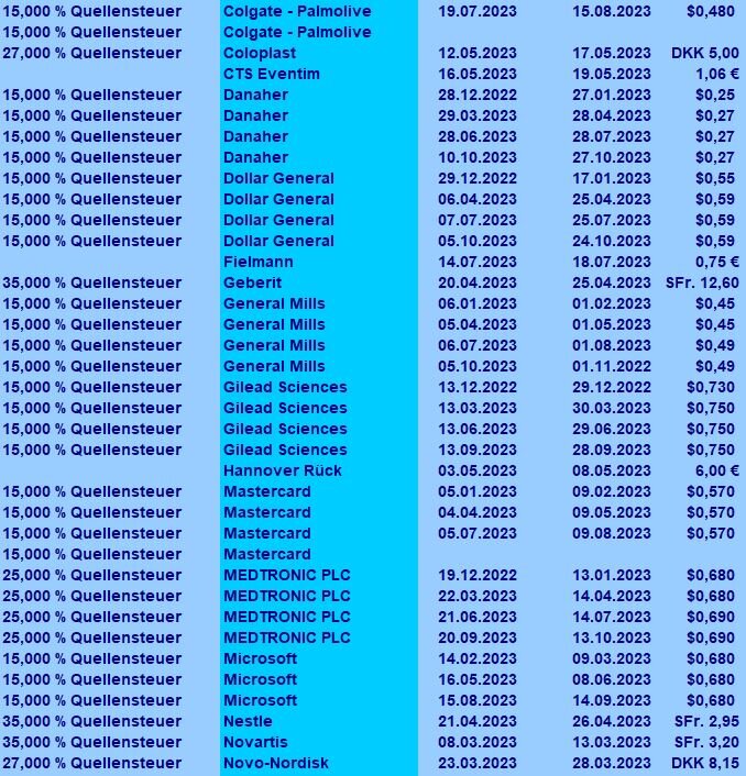 ghost_69 Oktober 14, 2023 Kleines Update: ... es ist viel passiert, Pepsi nach gekauft, 3M verkauft, einmal möchten die die Healthcare Spalte abtrennen, dazu die Dividende senken und das passt nicht in mein Bild, dazu hatte ich ca. 25% Verlust da drin, aus dem Verkauf habe ich Unilever zu 45,xx nach gekauft, dann kam der SpinOff von Danaher, der mit den Verlusten von 3M verrechnet wurde , dann gab es den SpinOff von Novartis, dann wurden Veralto und Sandoz Group eingebucht und beide direkt verkauft, wie schon geschrieben mit den Verlusten von 3M verrechnet, aus diesem Kapital habe ich Union Pacific nach gekauft und es ist noch etwas Kapital über geblieben. ... es gab auch wieder Dividenden ... ... Medtronic, TSMC und ThermoFischer haben ihre Dividende gezahlt ... ... für den Rocktober kommen noch 2 weitere und damit dürfte der Monat höher werden, als der vom letzten Jahr ... ... insgesamt liege ich bei 98,8% gegenüber dem Vorjahr ... Ghost_69 Diesen Beitrag teilen Link zum Beitrag