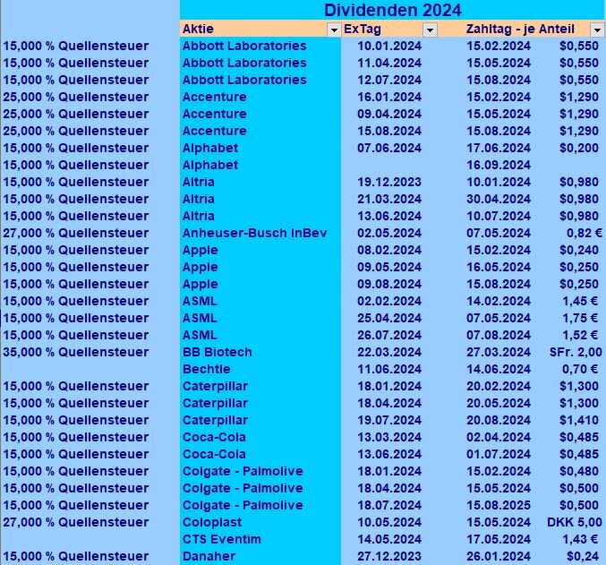 ghost_69 August 24, 2024 · bearbeitet August 24, 2024 von ghost_69 Kleines Update: ... zum Schulstart habe ich das ABC nach gekauft, die hatten auch gerade eine kleine Schwäche ... Die Mischung macht es aus: ... es gab auch wieder Dividenden: ... Novo-Nordisk und Cat haben ihre gezahlt ... ... damit sind alle Dividenden im August gelaufen und der August liegt 16,3% höher als der vom letzten Jahr ... ... insgesamt liege ich bei etwas über 86,1% gegenüber dem Vorjahr und es fehlen nur noch eine Hand voll Dollars gegenüber 2022. bei AVL hat sich leider nichts verändert. Ghost_69 Diesen Beitrag teilen Link zum Beitrag