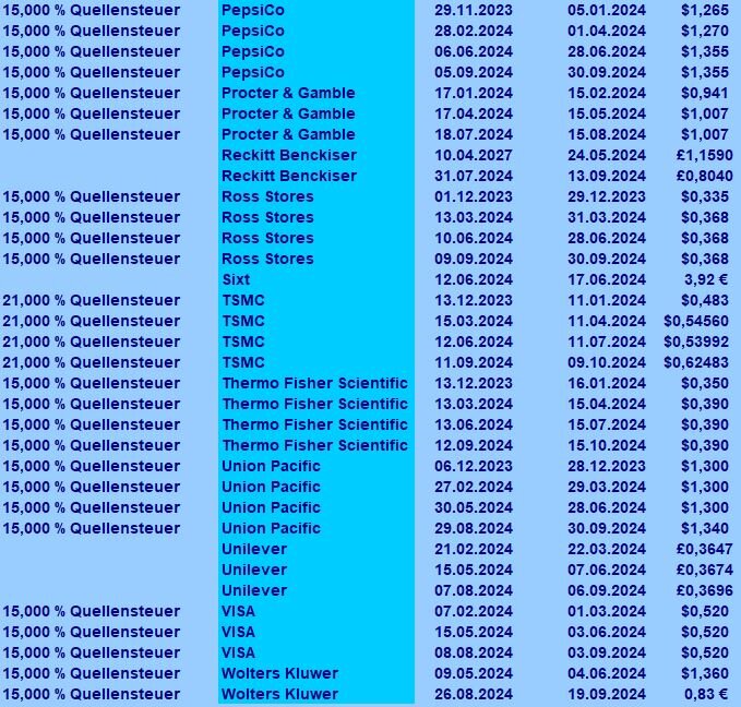 ghost_69 Oktober 5, 2024 Splash und Dash: ... im Depot ist nicht viel passiert, etwas rauf und etwas runter und wieder umgekehrt ... ... dafür gab es wieder Dividenden ... ... Gilead, Pepsi, Ross Stores, Union Pacific und Nvidia haben noch für den September gezahlt und dazu kam für den Rocktober schon die Dividende von Coca-Cola ... schmeckt jetzt doppelt so gut ... ... der September ist damit 17,5% höher ausgefallen als der vom letzten Jahr, Coca-Cola hat schonmal 40% vom letzten Oktober gefüllt ... ... insgesamt liege ich bei etwas über 97% gegenüber dem Vorjahr, der Oktober sollte nach vorsichtigen Hochrechnungen die 100% füllen, d.h. alles was dann kommt ist die Erhöhung für das Jahr 2024. Ghost_69 Diesen Beitrag teilen Link zum Beitrag