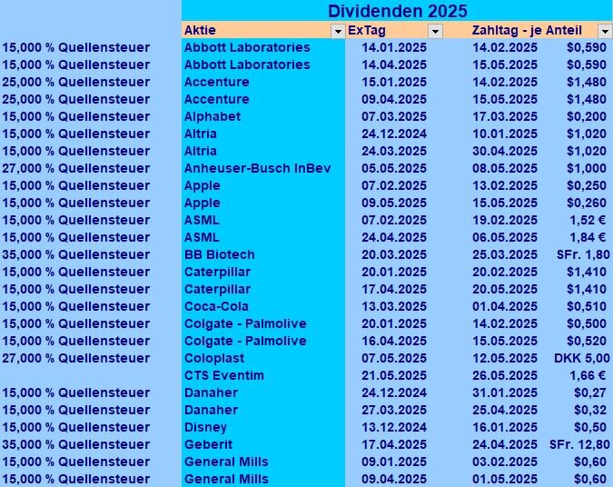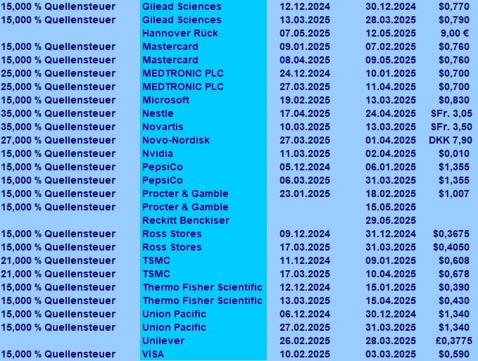 ghost_69 April 26, 2025 Splash und Dash: ... es gab wieder Dividenden ... ... Gebrerit, Nestle und Danaher (Erhöhung um 18%) haben ihre Dividende gezahlt ... ... der Monat April liegt bei 97% gegenüber dem Vorjahr und es kommt noch Altria mit seiner Dividende ... ... insgesamt liege ich bei 37,7% gegenüber dem Vorjahr ... ... auch das Depot sieht freundlicher aus, es steigt wieder, besonders sind hier die defensiven Werte hervorzuheben, ganz oben ist immer noch und war es auch in diesem Jahr Nvidia, sind einfach schon so viele Gewinne da drin ... kleines Update: ... Nvidia steht da dort schon viele Gewinne drin sind, Unilever und Nestle stehen wie eine Festung, Hannover Rück habe ich nach gekauft, weil hier der Trend intakt ist und es auch so gut aussieht ... Die Mischung macht es, gerade in diesen Zeiten: Ich denke auch das wir noch nicht durch sind und die Chaostage sicherlich noch kein Ende haben. Ghost_69 Diesen Beitrag teilen Link zum Beitrag