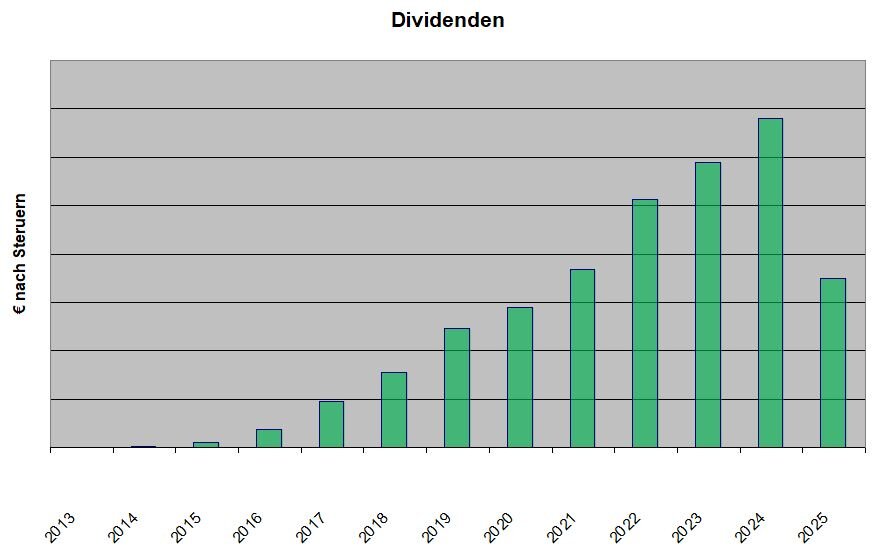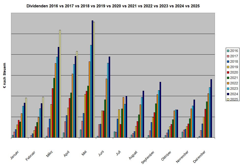 ghost_69 Mai 3, 2025 · bearbeitet Mai 3, 2025 von ghost_69 Update: ... die 2. Woche in der es wieder stark nach oben geht, besonders Novo-Nordisk, Microsoft und Fielmann ... Die Mischung macht es, gerade in diesen Zeiten: ... es gab auch wieder Dividenden ... ... Altria hat für den April als letzter gezahlt und gleich hat General Mills für Mai angefangen ... ... somit ist der April mit 6,15% höher als letztes Jahr gestiegen was auch an der Währung EUR vs USD liegt, und der Mai sollte Dank der Deutschen und Europäischen Dividenden wieder stärker werden ... ... insgesamt liege ich bei etwas über 40,5% gegenüber dem Vorjahr und der Mai sollte wieder der stärkste Dividendenmonat werden und damit schon insgesamt wesentlich mehr als die Hälfte vom letzten Jahr einbringen ... ... hier mal der Chart seit es Aufzeichnungen gibt ... Ghost_69 Diesen Beitrag teilen Link zum Beitrag
