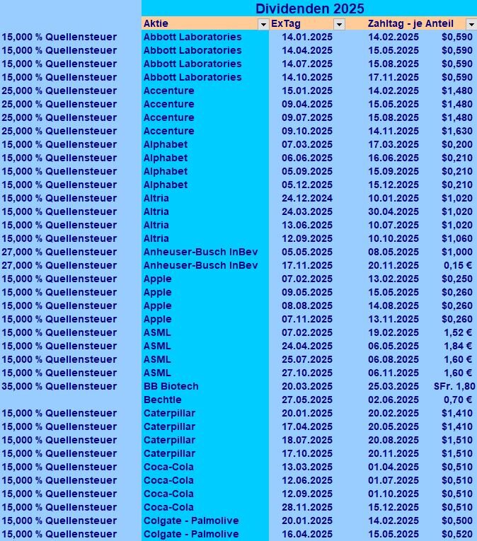 ghost_69 November 22, 2025 · bearbeitet November 22, 2025 von ghost_69 Kleines Update: Am 15.11.2025 um 12:55 von Holgerli: Herzlichen Glückwunsch. So weit bin ich noch nicht, weil der November bei mir sehr schwach ist. Dafür ist der Dezember umso stärker, sodass ich auch mit einem weiteren Wachstum in 2025 (im Vgl. zu 2024) rechne. Danke und es geht noch weiter. ... was eine Achterbahnfahrt die letzte Woche, einen Tag stark nach oben um dann den Tag mit dem selben Anstieg als Verlust zu beenden. Aber auch sonst ging es heiter weiter, gestern Abend ging wieder alles rauf. Coca-Cola geht Richtung Allzeithoch, Alphabet zieht deutlich an und Ross Stores machte gestern mal eben über 8%. Die Mischung macht es: ... Dividenden gab es auch wieder ... ... Abbott, P&G, Anheuser (Überraschung) und Cat haben gezahlt ... ... damit liegt der November etwas über 6,2% höher als der vom letzten Jahr und schießt damit auch ... ... insgesamt liege ich jetzt etwas über 3,7% gegenüber dem Vorjahr und ein guter Monat kommt noch und bringt das Coca-Cola Fest mit ... ... ich bin weiter im Plus mit meinem Depot, auch wenn es etwas weniger als vor 14 Tagen ist ... Ghost_69 Diesen Beitrag teilen Link zum Beitrag