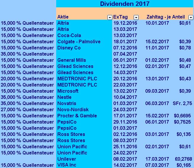 ghost_69 März 11, 2017 · bearbeitet März 14, 2017 von ghost_69 ... das Update: Es wurde Novartis gekauft, einmal Schweiz, dann Pharma, wir werden alle älter und brauchen Pillen, aber die haben sich von ihrem Abwärtstrend abgekoppelt, daher mal beherzt zugegriffen und natürlich auch wegen der Dividende, schade nur um die 35% Quellensteuer. Diesen Monat gab es schon 3 Dividenden, Microsoft, Novartis und VISA 7 weitere sollten noch folgen, wenn ich mich nicht irre. damit habe ich gegenüber letztem Jahr schon das 3-fache an Dividende und es geht noch weiter, grob hochgerechnet müßte ich etwa beim Mai 2016 raus kommen und das war in 2016 der beste Monat. ich habe also auch schon mehr Dividenden als 2015 bekommen und wir haben erst Anfang März, hier noch alles zusammen zum downloaden: Mein Aktiendepot 10-03-2017.pdf Ghost_69 Diesen Beitrag teilen Link zum Beitrag