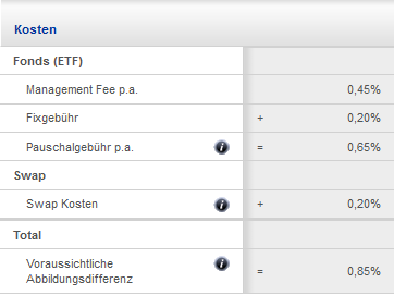 chart Dezember 11, 2014 Kosten DBX1EM db x-trackers MSCI Emerging Markets Index UCITS ETF 1C Management Fee p.a. 0,45% Fixgebühr +0,20% Pauschalgebühr p.a. =0,65% Swap Swap Kosten +0,20% Total Voraussichtliche Abbildungsdifferenz =0,85% (TER) Diesen Beitrag teilen Link zum Beitrag
