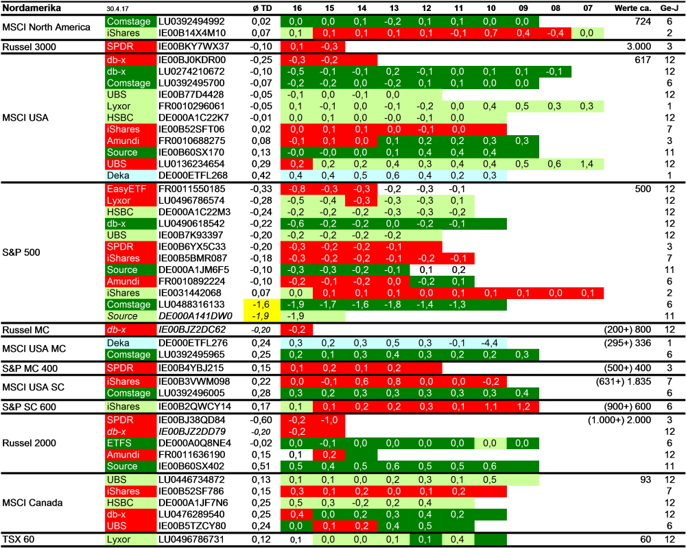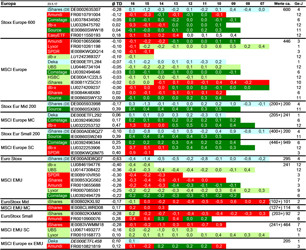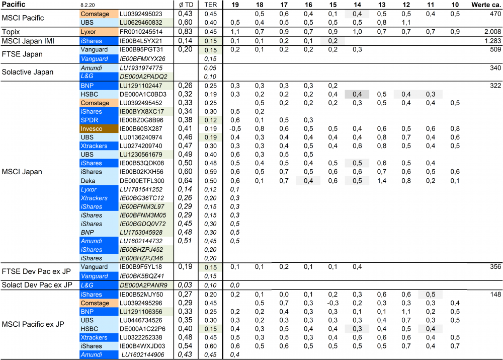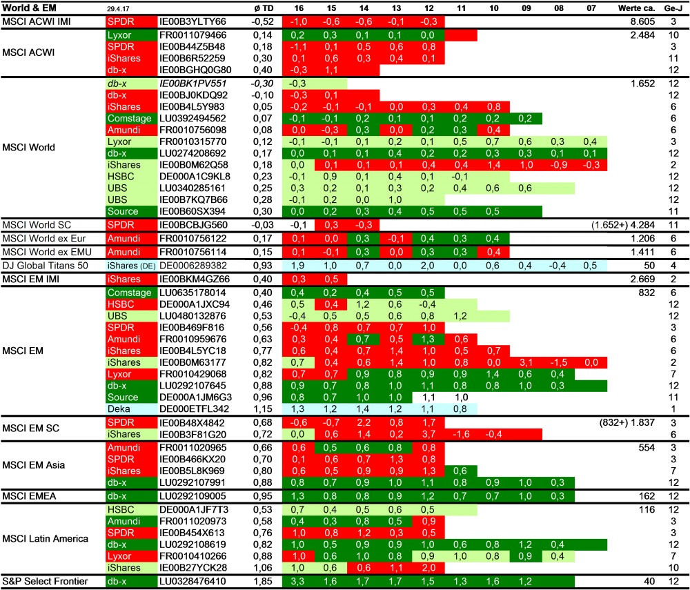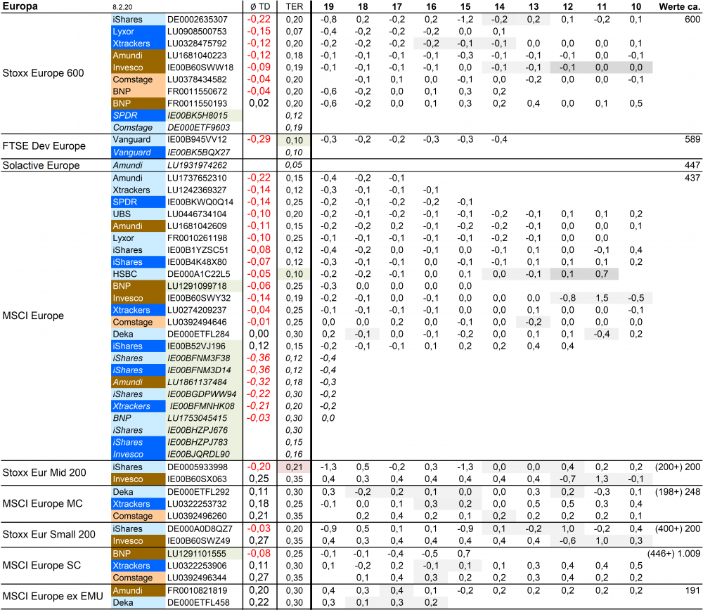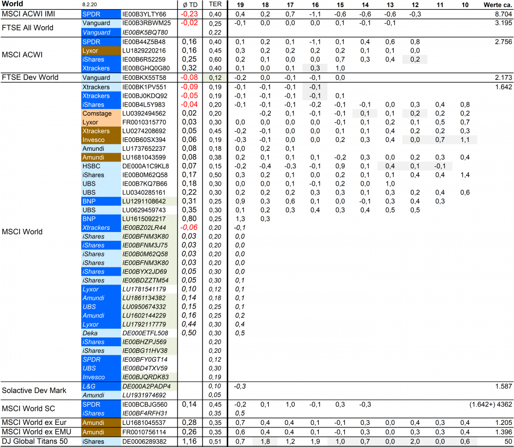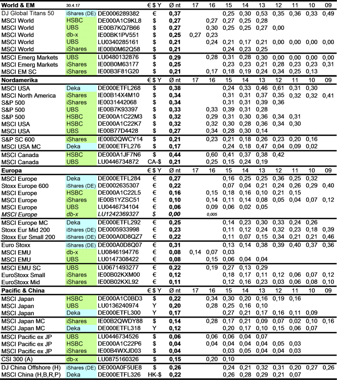 Holzmeier Dezember 15, 2014 · bearbeitet Dezember 15, 2014 von Holzmeier vielen Dank fuer deine Anregungen 2 Verbesserungsvorschläge: (1) Die Liste in Textform überführen, so dass man z. B. die ISINs bequem weiterverwenden kann ohne mühsam vom Screenshot abzutippen. die ISINs in den Tabellen sollten eigentlich nur zur eindeutigen Identifizierbarkeit dienen. Nach eintippen von z.B. "MSCI USA Comstage" waeren die jeweiligen ISINs ja auch anderweitig vergleichsweise aufwandsarm zu ermitteln. Wenn sich an den Informationen etwas ändert kann dann auch jemand anderes die Pflege übernehmen. Der derzeitige Stand hat sonst in einigen Monaten oder gar Jahren nur noch wenig Wert. du hast natuerlich recht, dass solche Listen ohne Pflege zu veralten drohen. Deshalb habe ich vor, die Tabellen ca. halbjaehrlich zu aktualisieren. (2) Die tracking difference von anderer (verlässlicher) Seite als Link einbinden, statt die Daten manuell zu pflegen. Die TD und die Sortierung kann in einigen Monaten oder gar Jahren ganz anders aussehen. Ich wuesste nicht, ob bzw. wo diese Daten auch noch in 5 Jahren ganz sicher wartungsfrei mit der gleichen Programm-Schnittstelle downloadbar waeren. Die mittleren TDen aendern sich ja auch nur einmal jaehrlich, und gluecklicherweise sogar alle zum gleichen Zeitpunkt ... Diesen Beitrag teilen Link zum Beitrag